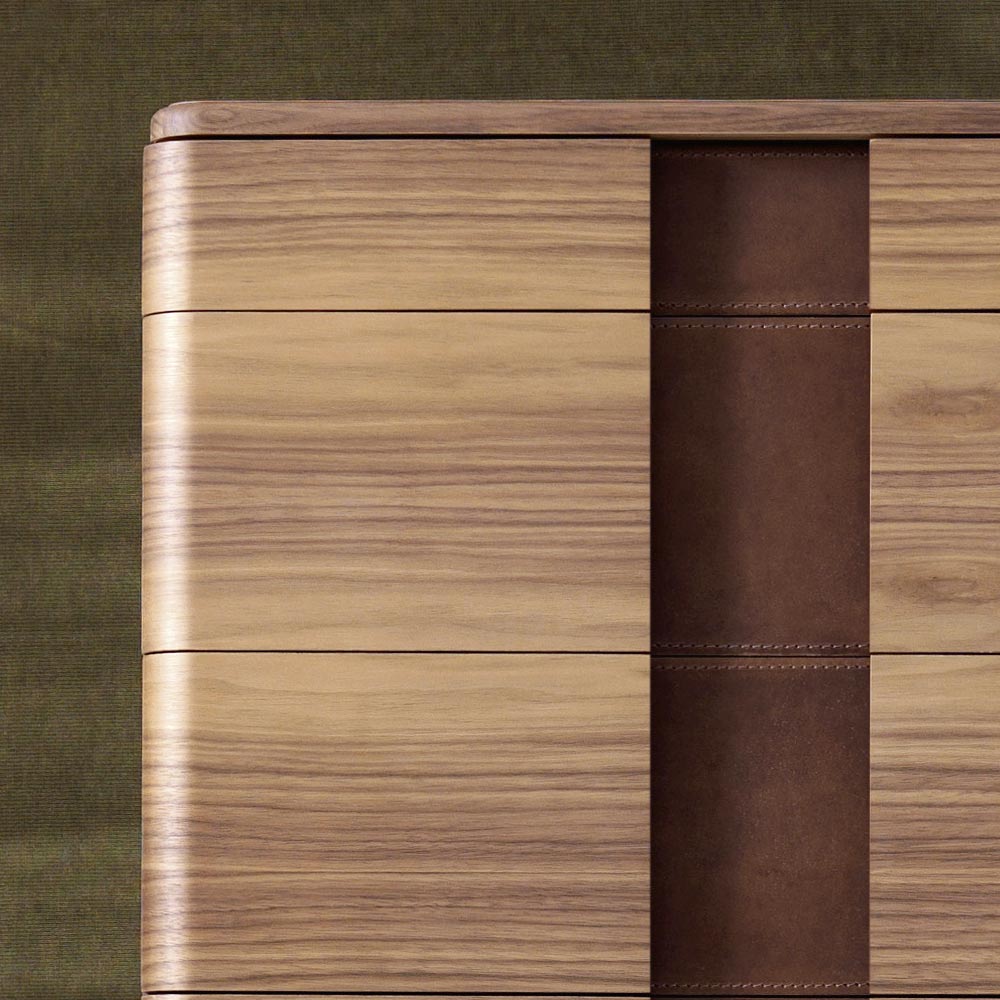 Base and top in solid canaletto walnut wood and frontal inserts in natural leather.