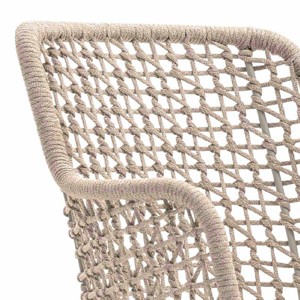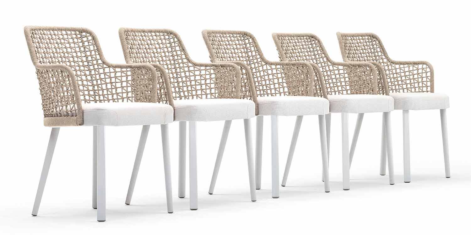 Emma is an outdoor armchair characterized by a hand-woven synthetic fiber structure with beige powder-coated aluminum frame.