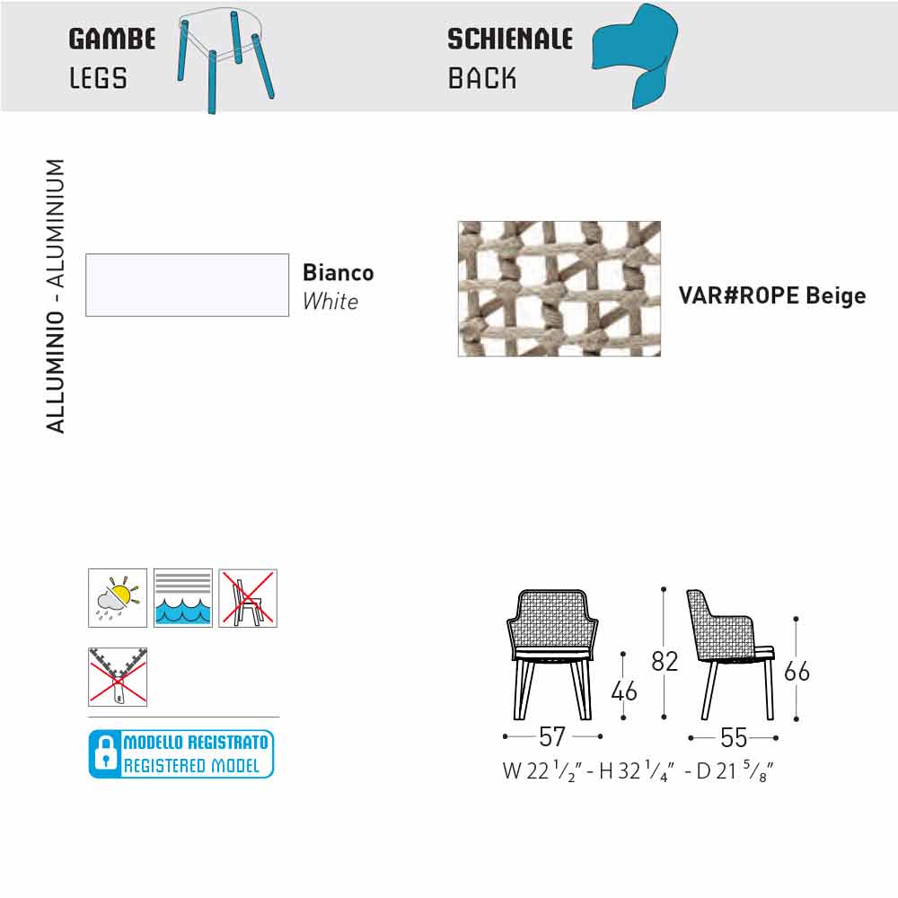 It also comes with legs in white painted aluminum and a seat upholstered in fabric with a polypropylene seat structure.