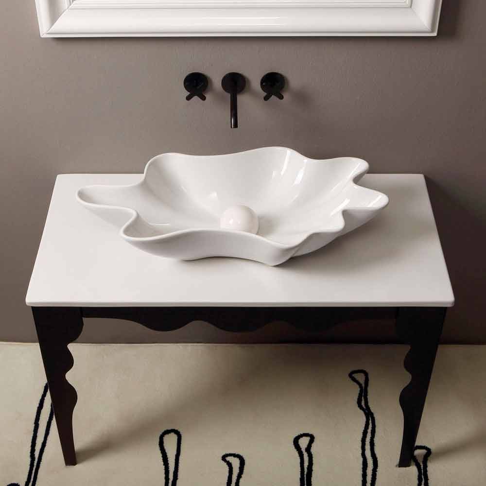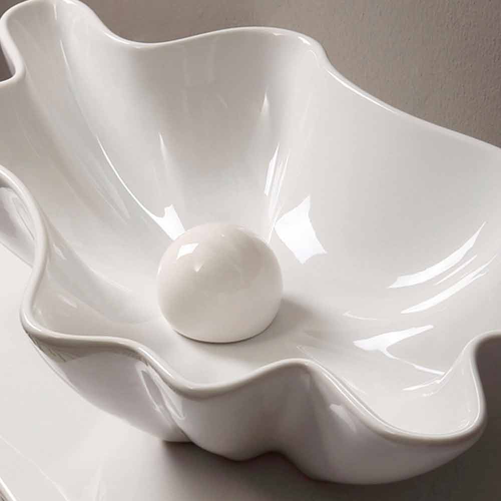 Modern design ceramic counter top washbasin made in Italy Rayan Washbasin that recalls the sea through its pearl-shaped drainage thus creating the illusion that it is an oyster. From important dimensions, even in height; produces a decisive effect, as a true protagonist of the bathroom.