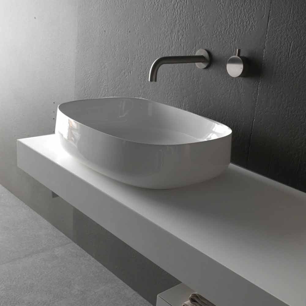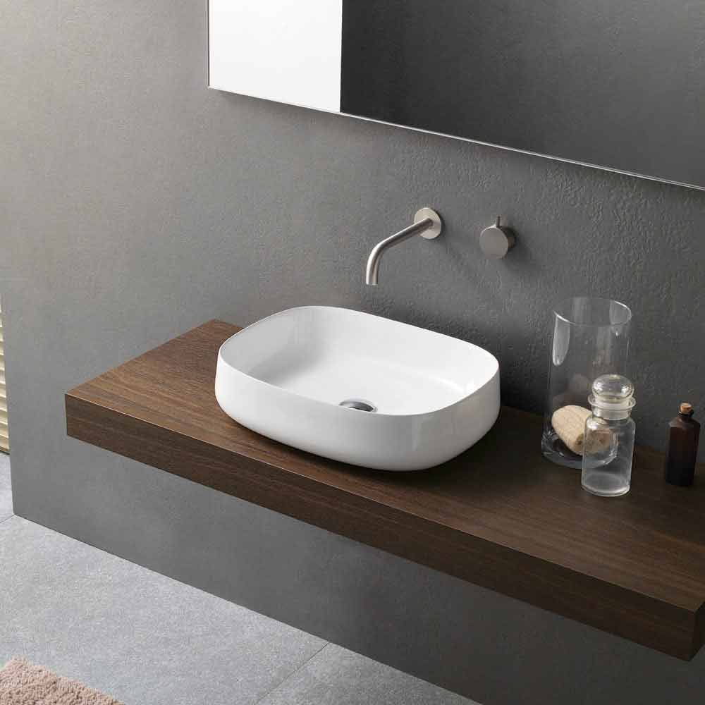 Countertop ceramic washbasin without overflow hole and drain excluded. A modern and timeless complement, with soft lines and easily adaptable to any contextual style.