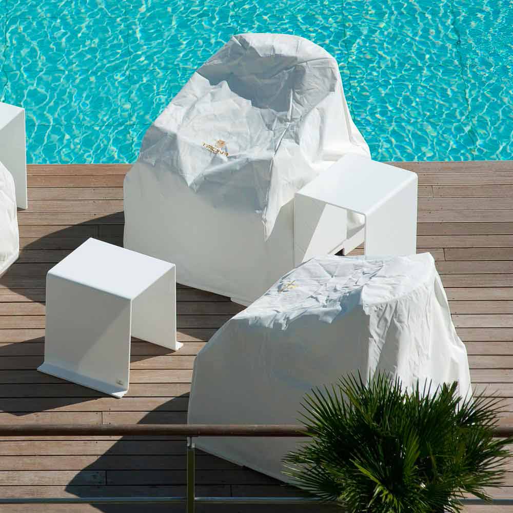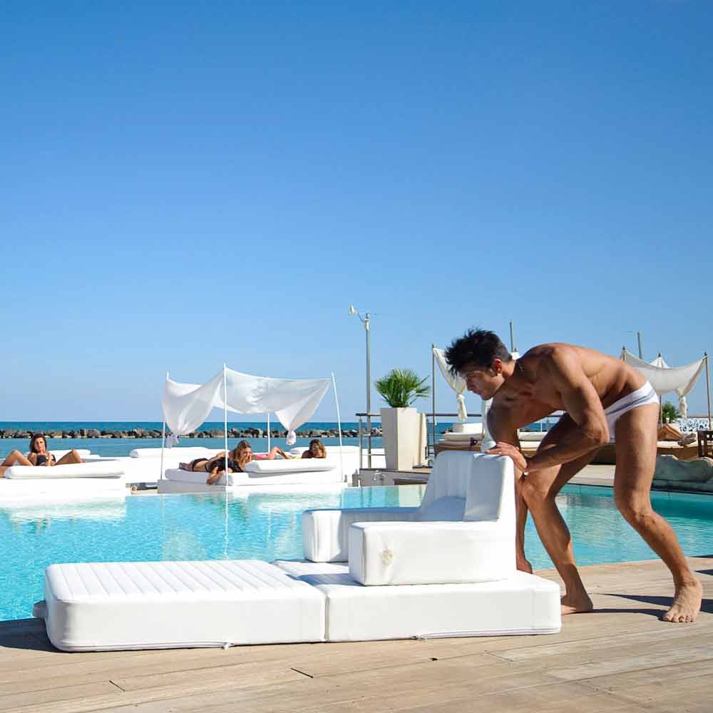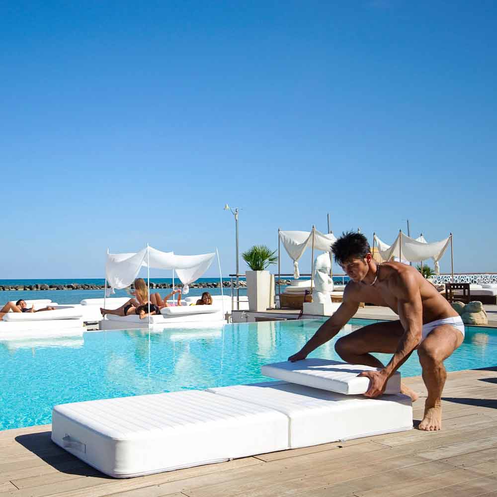 Modern design white floating pool lounger Trona Luxury, made in Italy Trona Luxury is a unique armchair which can be used both as a poolside armchair and a floating pool lounger. It is made of white eco-friendly marine faux leather and EPS. This kind of faux leather is designed for outdoors and it is certified, water-resistant and fireproof. The outdoor chair Trona is completely cutted and hand-sewn in Italy.