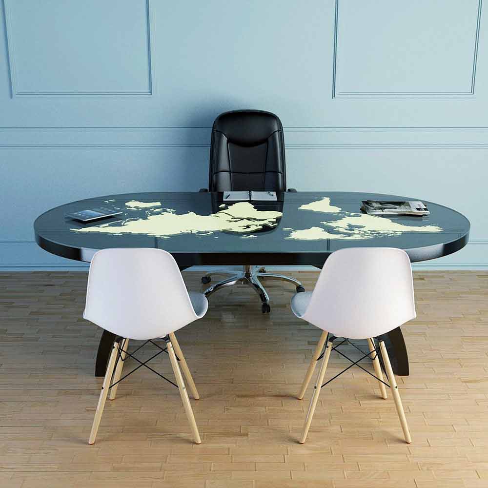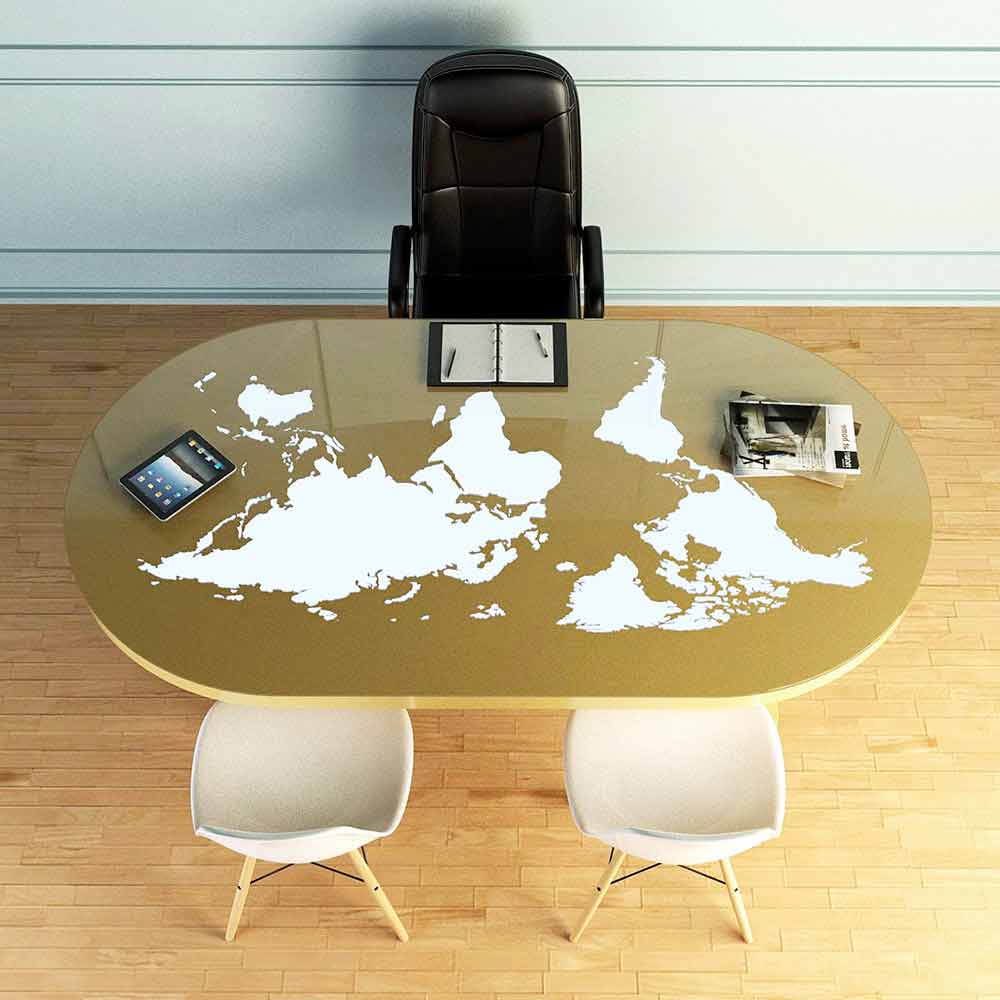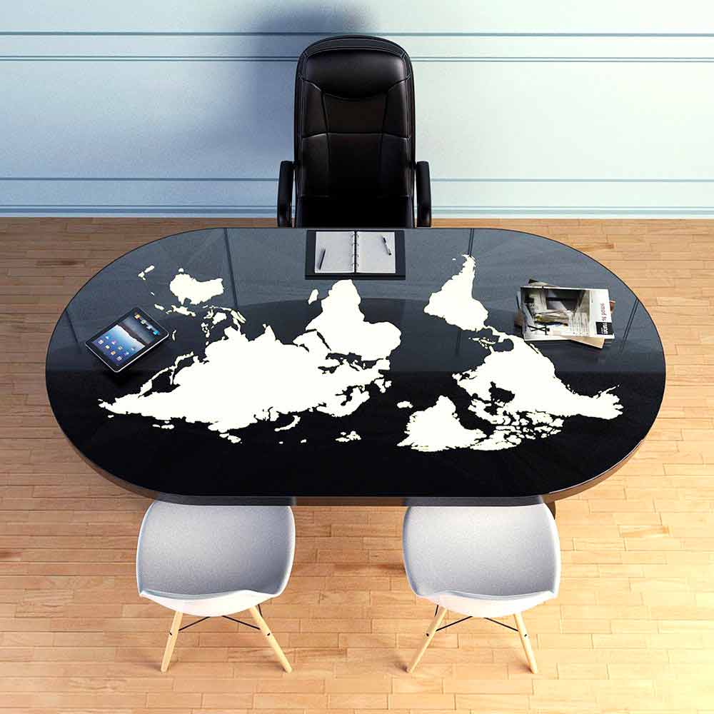 Pontida is a desk table with a ultramodern design, realized in Solid Surface and surface in glass where is represented the entire world that, thanks to the LED, lights up and change colour at your leisure with a specific APP that will allow you to control the colour and the light intensity.