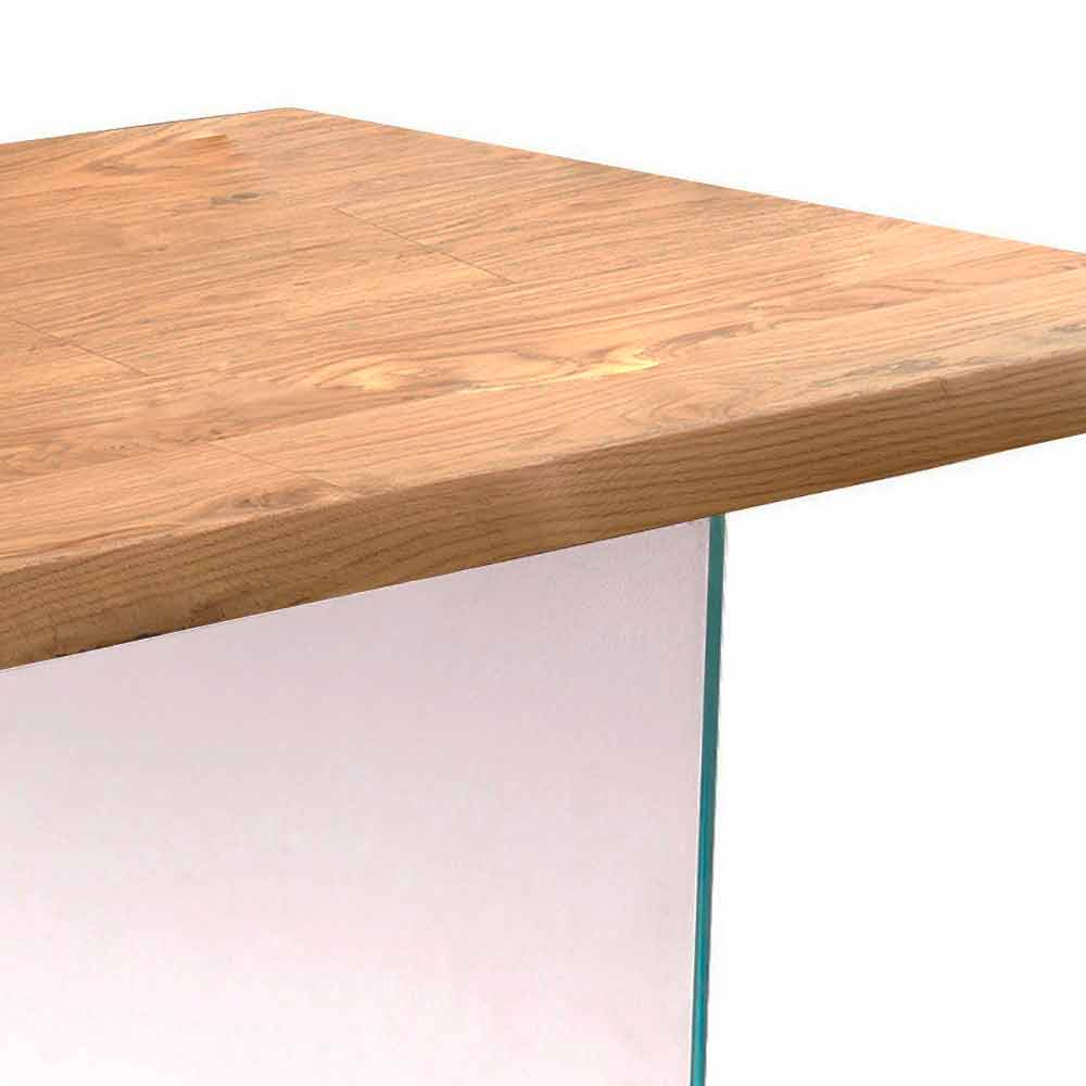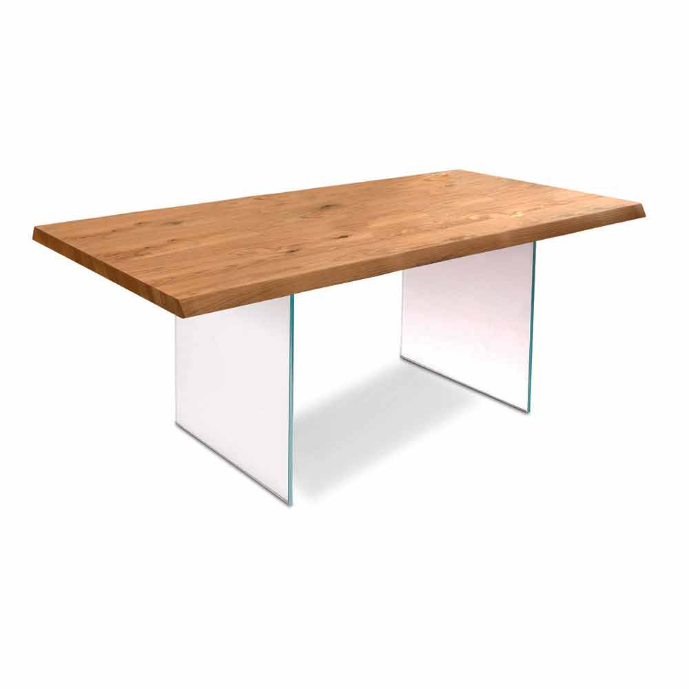 The Nico table is characterized by a design played on the contrast between different materials such as wood and glass. The base is in fact made of 12 mm extra-light tempered glass, while the top is in raw oak veneer with a peeled and peeled edge.