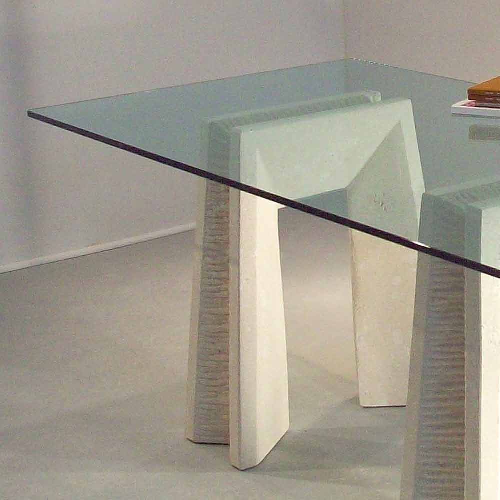 The dining table Arianna is entirely made in Italy. Its base is made of Vicenza natural stone and it has been hand-carved from the original stone block. The table top is made of float crystal (15 mm thickess) layd on the base.