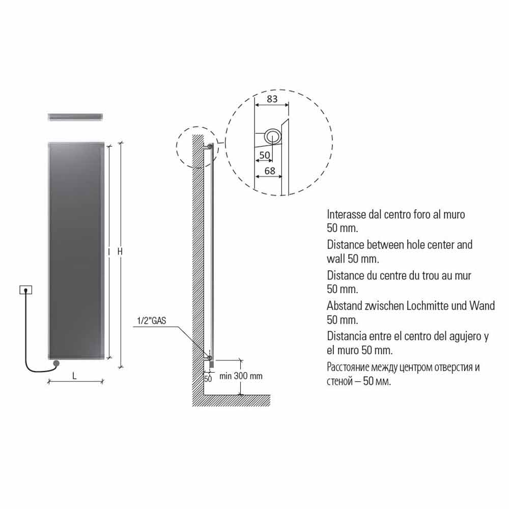 Included is the electric resistance with infrared equipped with standard remote control, 1200mm cable with schuko plug and a glycol supplement to be used as antifreeze and rust inhibitor for the protection of the system. On request, the digital electric resistance and the resistance cover in the same finish as the radiator are available; or resistance only on the left and inserted vertically in the radiator and hidden receiver, daily / weekly programming thermostat and radio frequency receiver. The center distance can be customized on request with a distance of 50 mm to be chosen between center or right. The version with the hydraulic installation of the radiator is also available. Contact us for a quote.