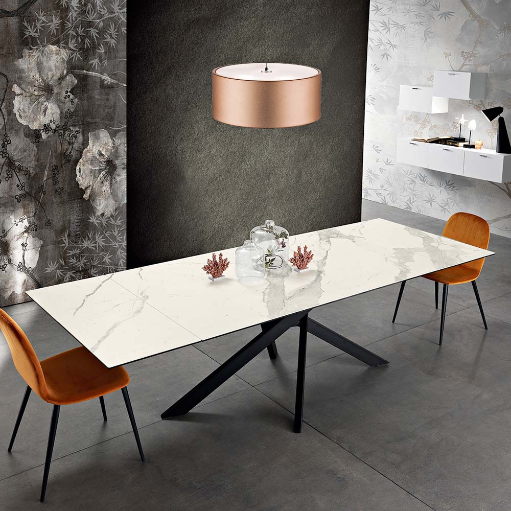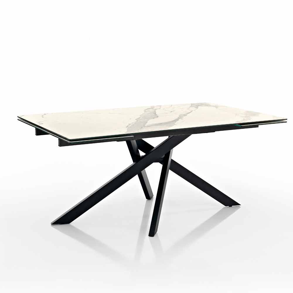Dionigi is a etxtendable rectangular table realized in Italy with a paintedmetal base and a surface inclusive of glass-ceramic extensions.