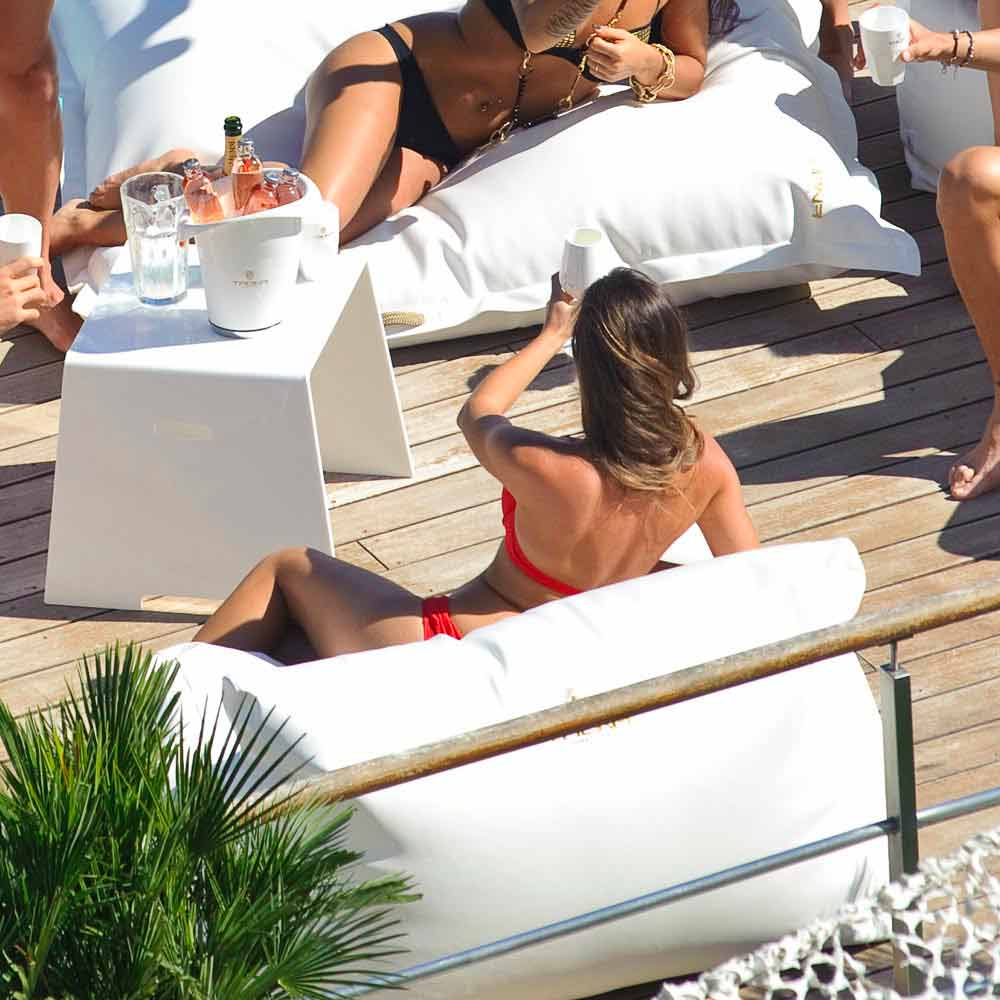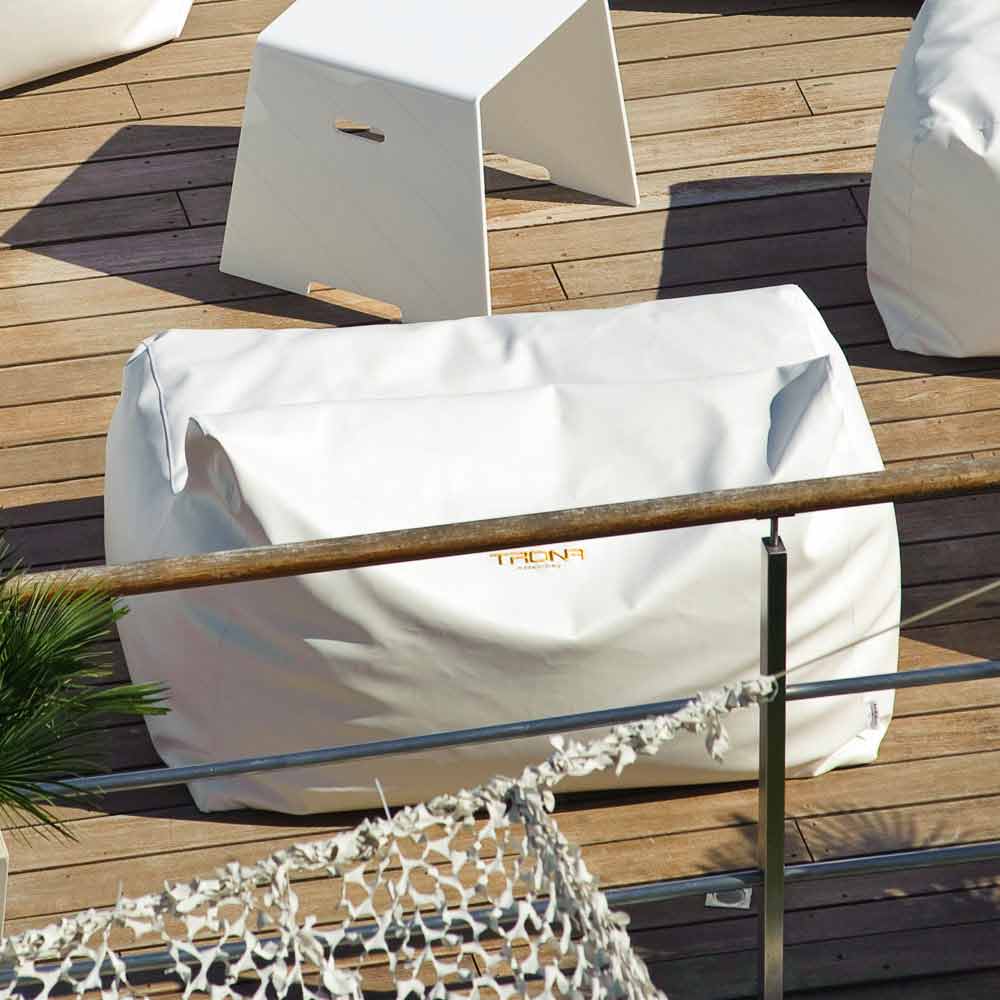 The poolside sofa Cloud has a comfortable seat which perfectly fits with your body and it is covered with soft eco-friendly marine faux leather. This kind of coating is certified for outdoors and it is stain-resistant, anti-humidity, removable, easily washable, water-resistant and fireproof. It is completely cutted and hand-sewn in Italy.