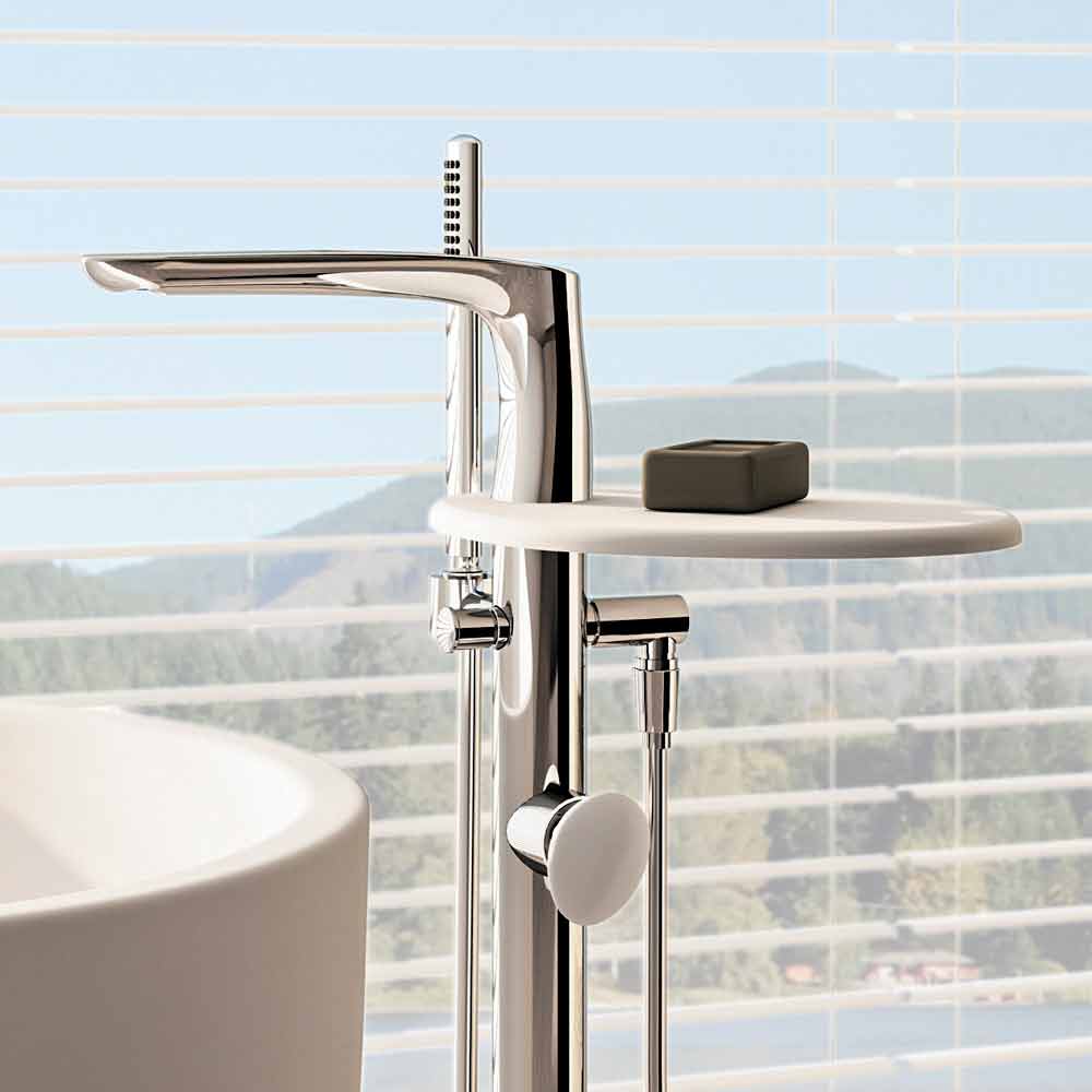 Deck mounted bath mixer with duplex hand shower, diverter and shelf in DuPont ⢠Corian® Made in Italy.