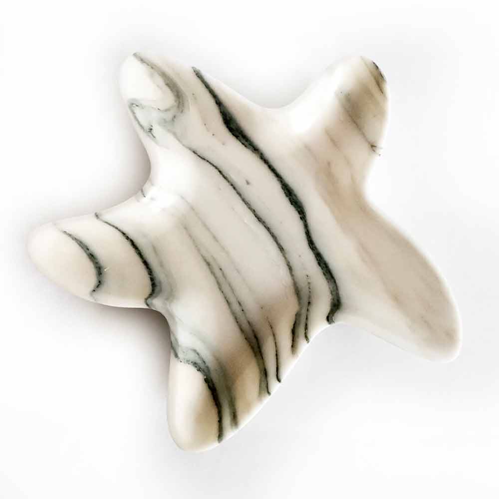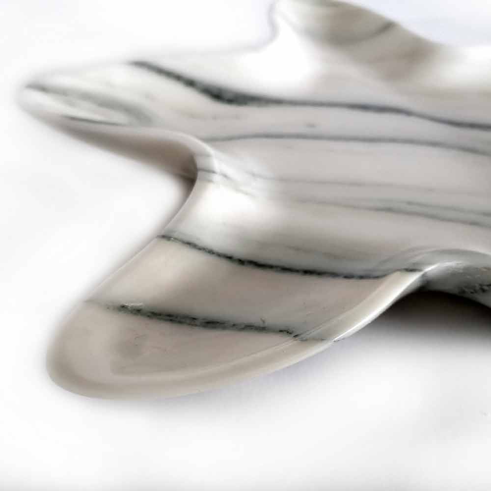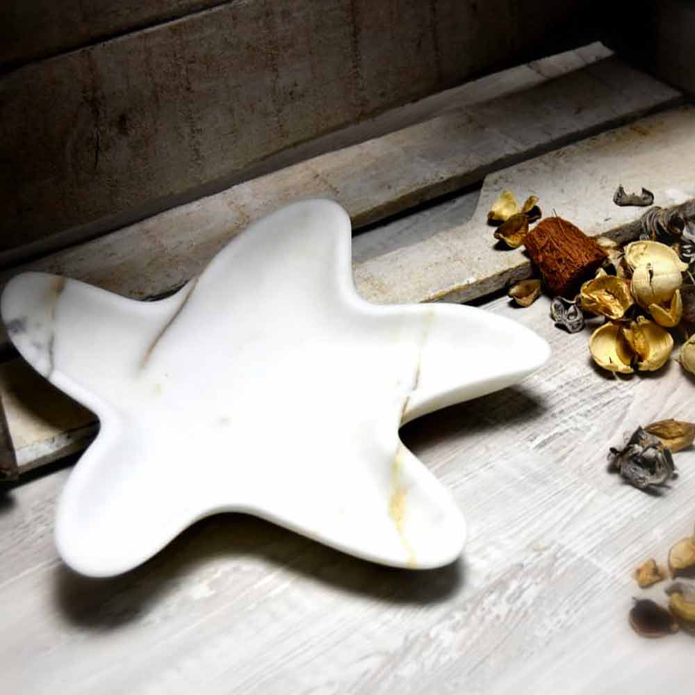 Saucerhandmade in Italy by master craftsmen in marble with a matte satin finish obtained thanks to an artisan process that gives the product further quality and refinement. What characterizes this article is undoubtedly the particular starfish shape which recalls the charm of marine fauna and which, thanks to its simple and sinuous lines , allows to enhance the particular veins of the marble.
