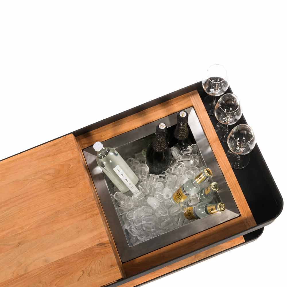 Bring this mobile bar on wheels wherever you go, to keep drinks always fresh and close at hand! It can be used with or without ice cubes and no electrical connection is required. In fact, it keeps drinks and food cool thanks to the double chamber cooling container with lid. It is a multifunctional product: bar / table for indoor and outdoor use.