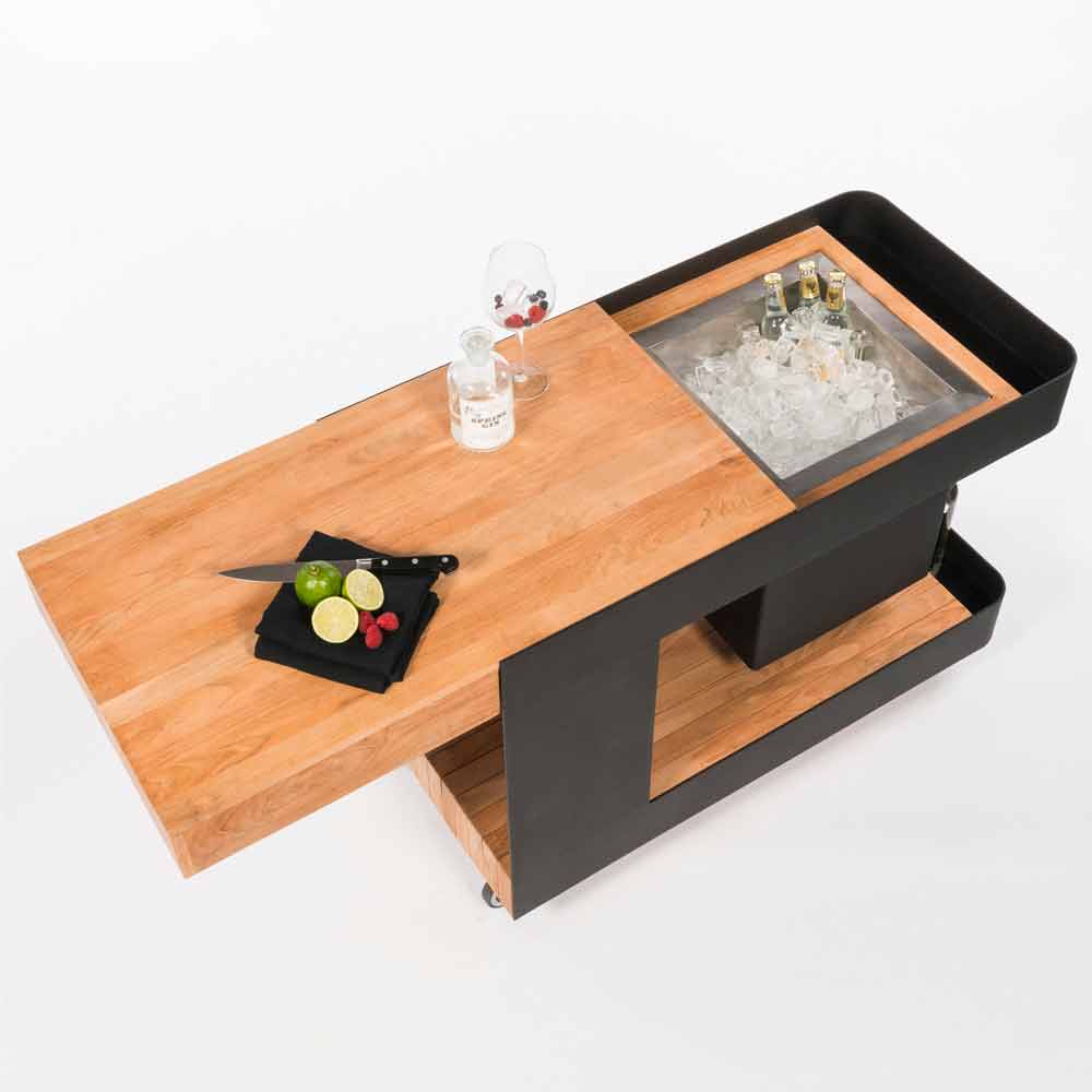 Mobile bar on wheels for outdoor with table, modern design, made of wood and steel, high quality.