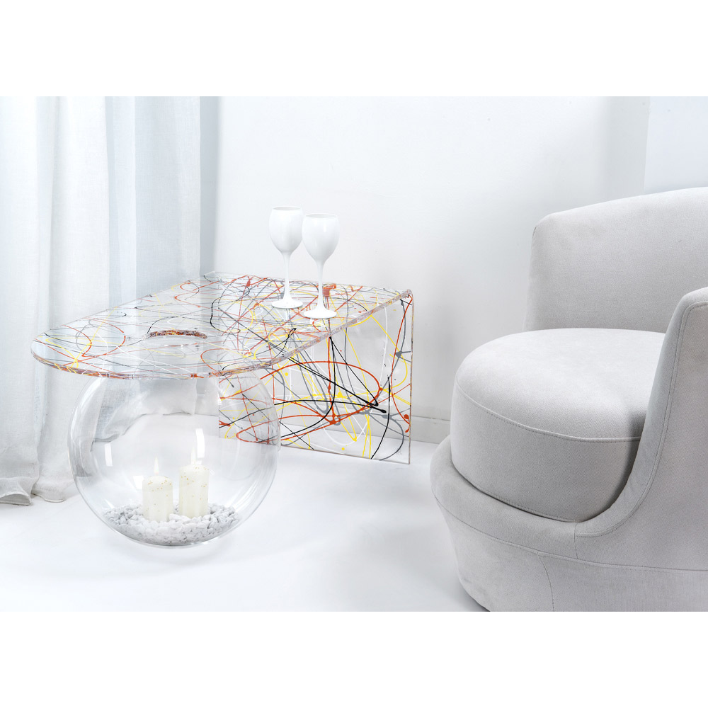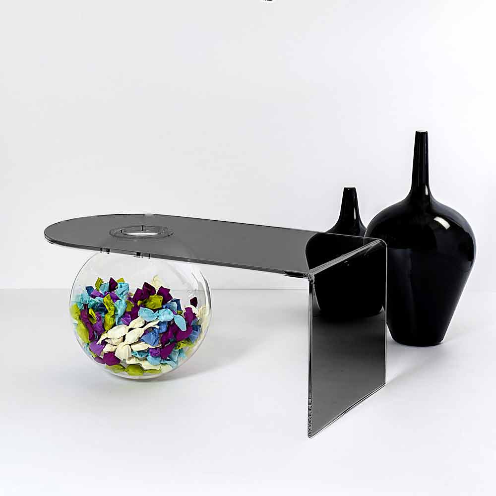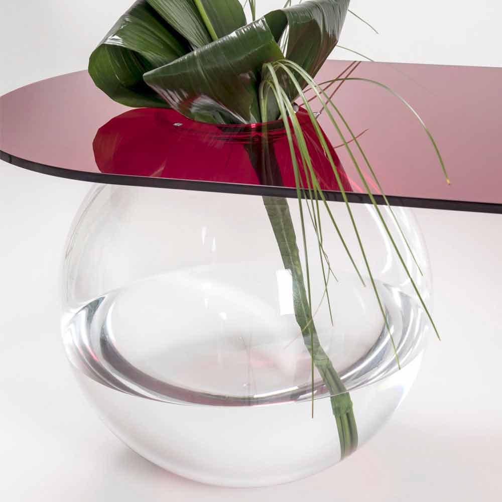 Bolly is a curved table handcrafted in Italy in 100% virgin polymer PMMA plexiglass, laser cut, thermoformed at high temperatures and assembled to a spherical structure that can be used as a flower vase, an aquarium or simply as a container.
