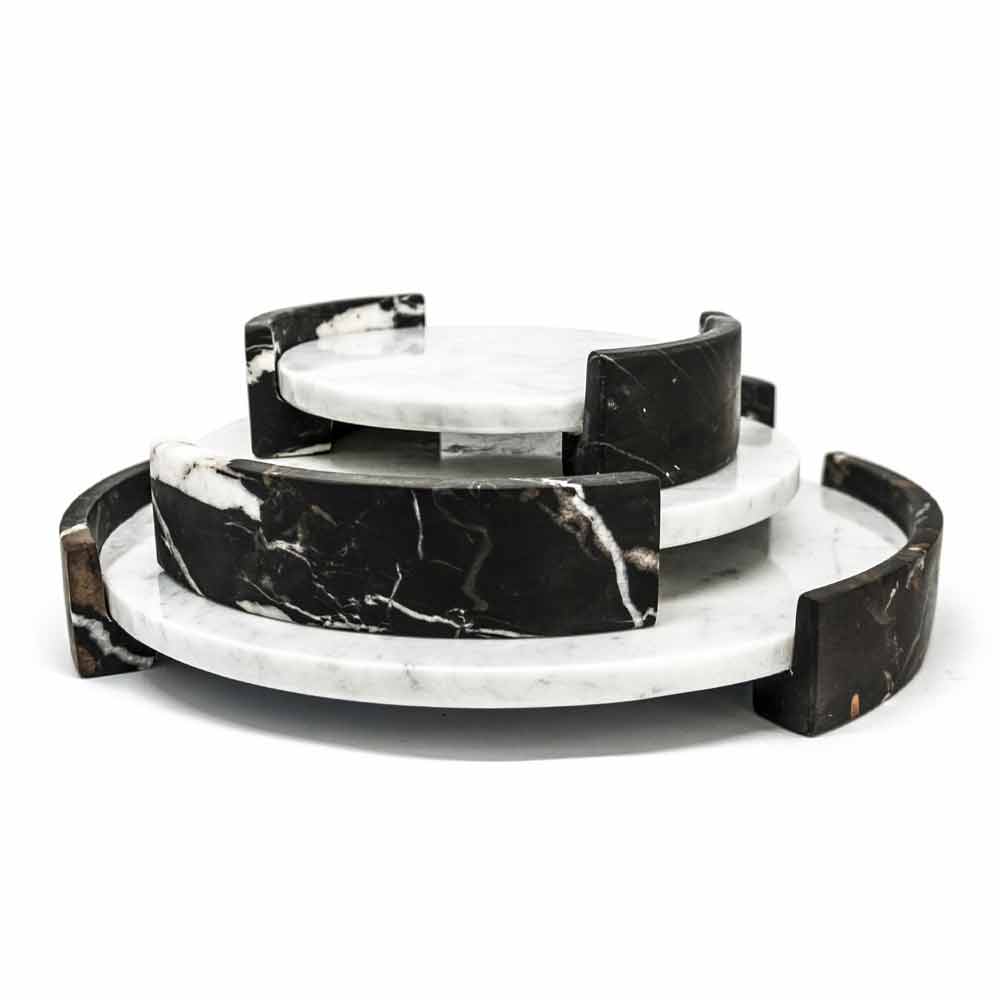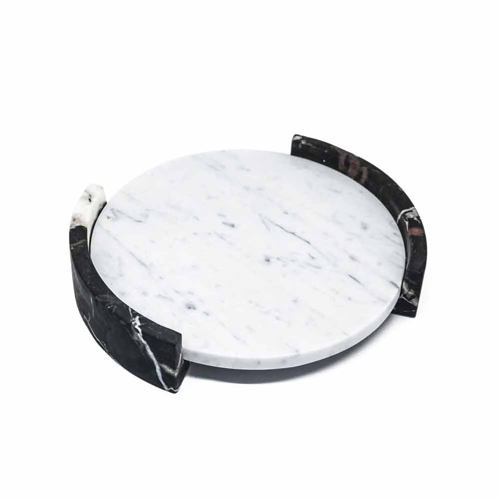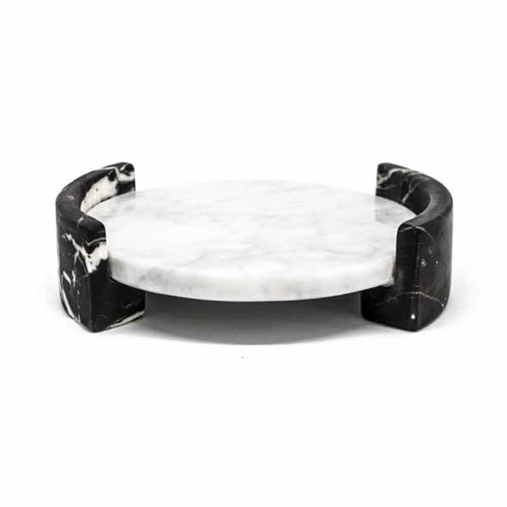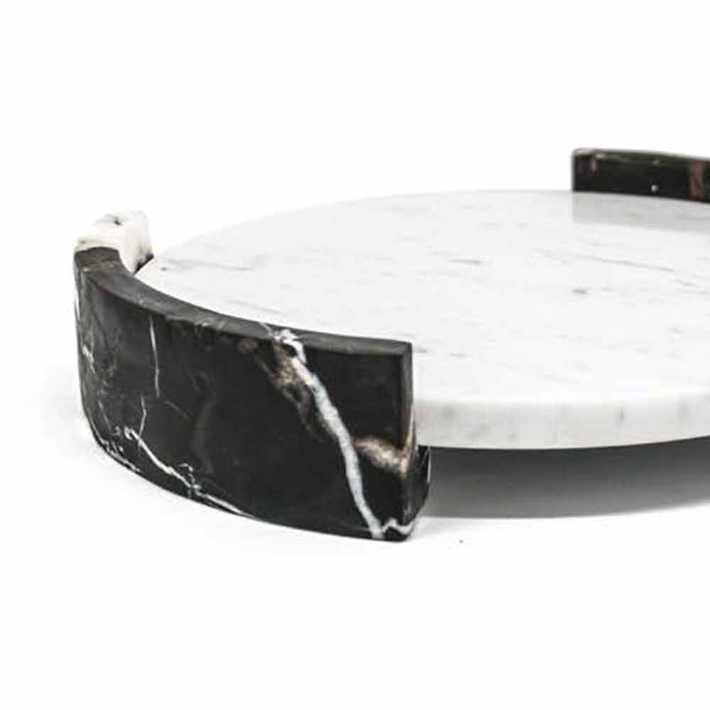 Round tray made of white Carrara marble. It is a uniquepiece as each block of marble is different in veins and shades. The marble used for the realization of the product comes from the Poggio Silvestre quarry which is a source of first quality white marble classified since the last century. Product made by hand by Italian artisans specialized for generations in marble processing. Precisely for this reason, any variation in shape and color must be considered as a guarantee of craftsmanship.