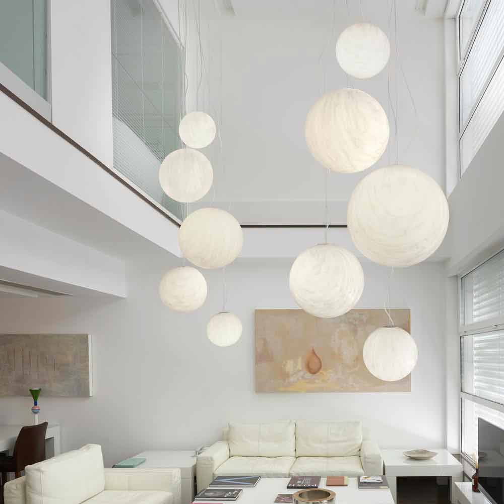 It can be used both as a single chandelier and as a composition of spheres of different sizes to transform it into a large luminous fulcrum that can be combined with a rosette for five Mineral lamps, sold separately.