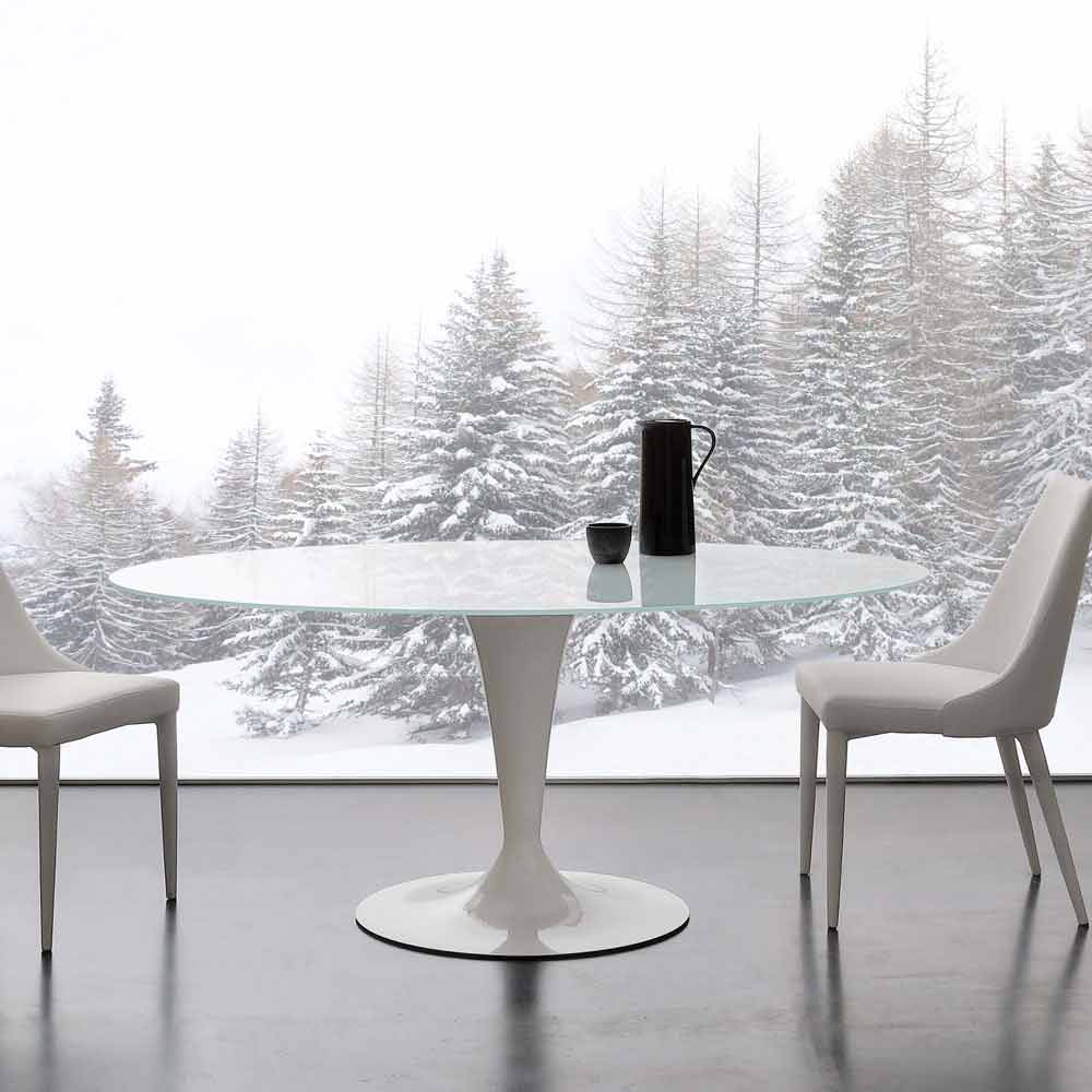 Modern table Aurora, made of extrawhite tempered glass and steel.