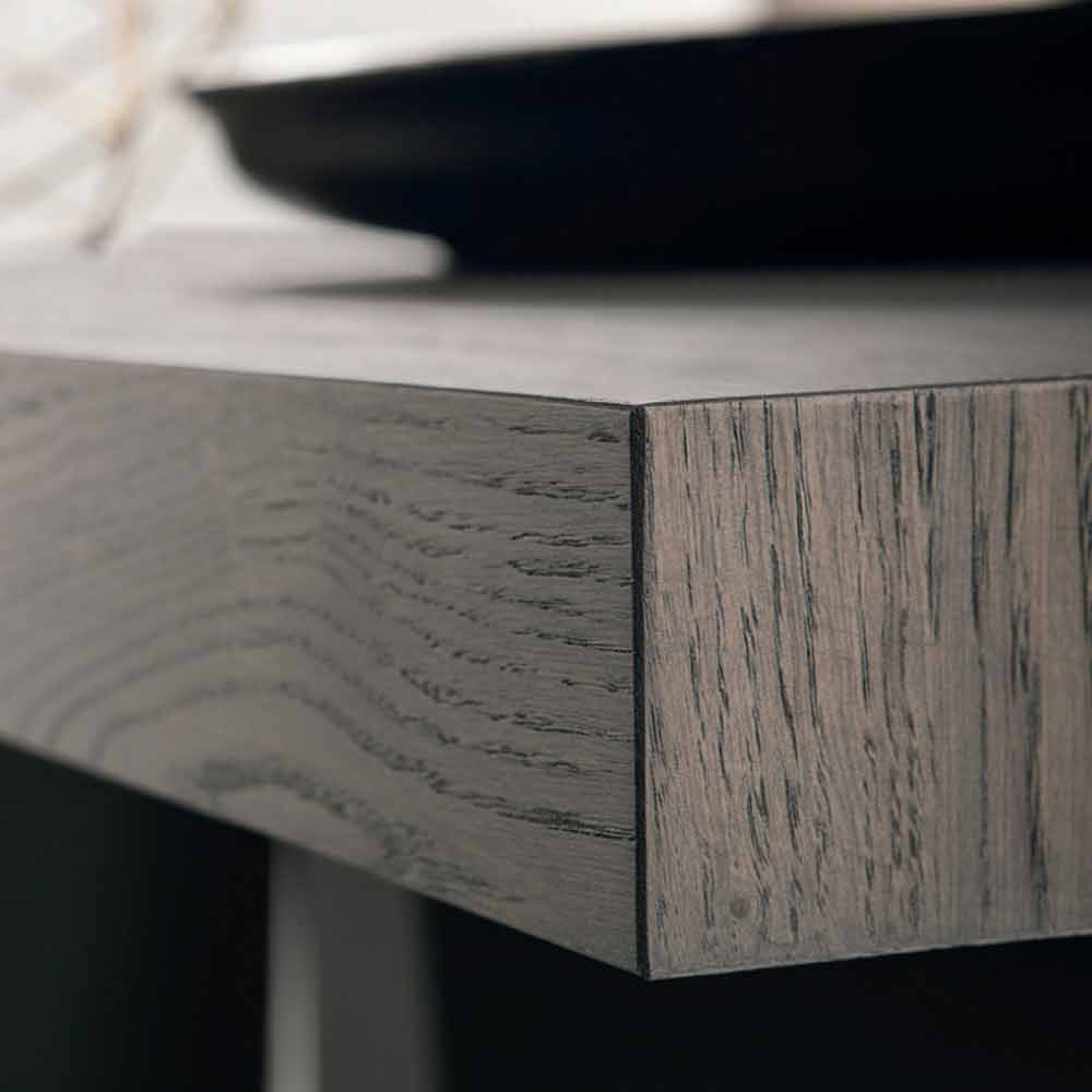 The structure is composed by sloped metal panels with anthracite micro-embossed finish; while the top, with a 60 mm thickness is in veneered knotted oak wood with folding processing.