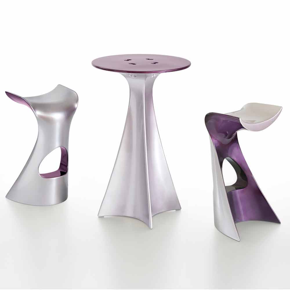 The high JET NEXT table has a modern and contemporary design. This product, designed by Karim Rashid, is a perfect partner for the iconic Koncord stool. To celebrate the tenth anniversary of collaboration between Slide and the eclectic designed, a special metallic bicolored lacquered version is born. The silver base blends with the purple top. For a furniture that leaves its mark, the Next collection allow to join two different souls: the visionary and futuristic one, given by the forms of Jet and Koncord, and the unique and elegant one, given by the speciale and glazed color, almost changing, of the special edition.
