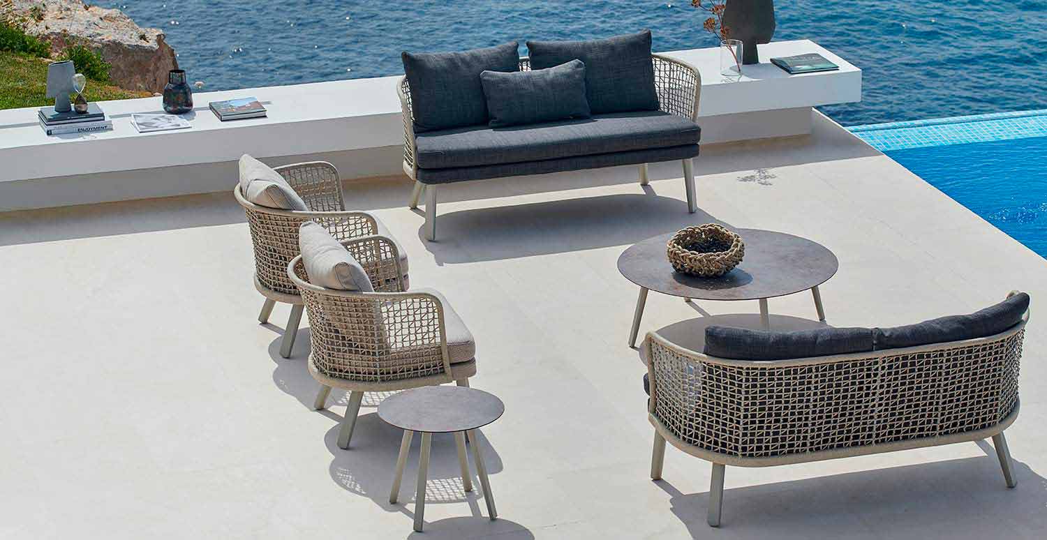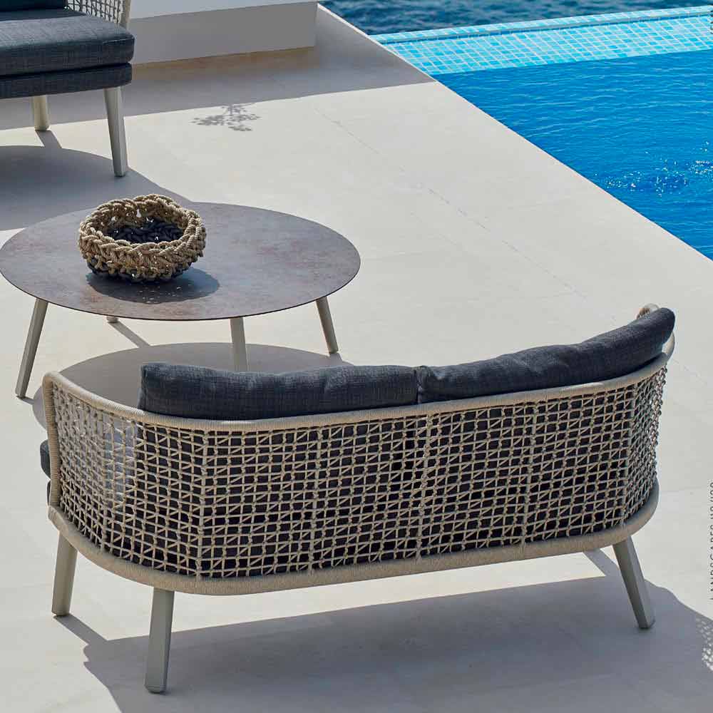Emma is a wonderful outdoor sofa characterized by a hand-woven synthetic fiber structure with beige powder-coated aluminum frame.