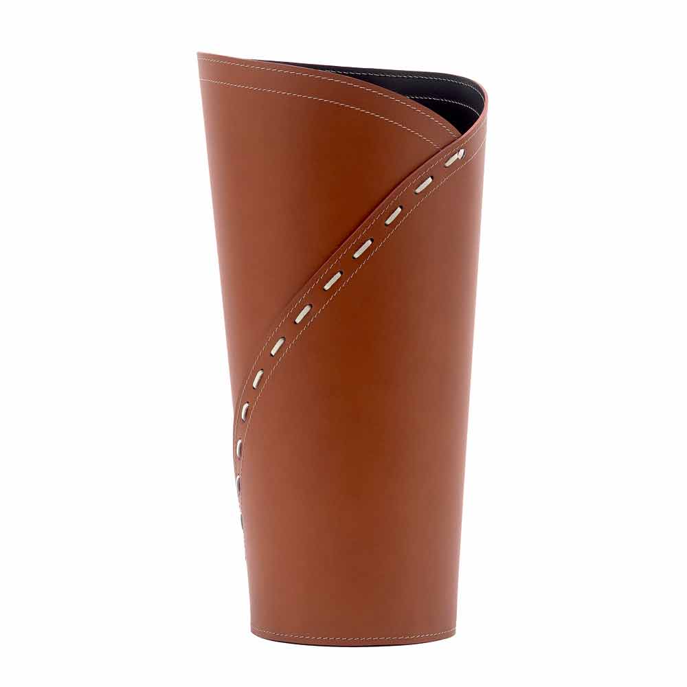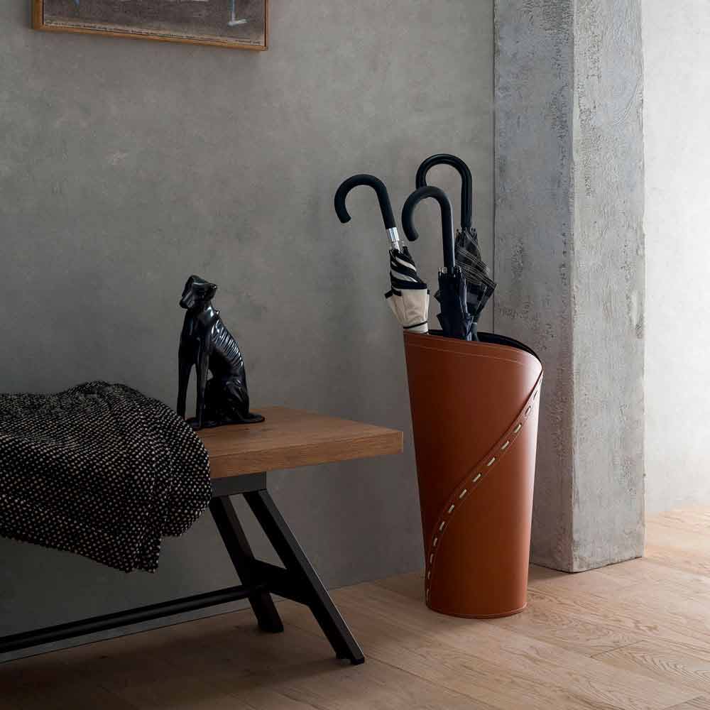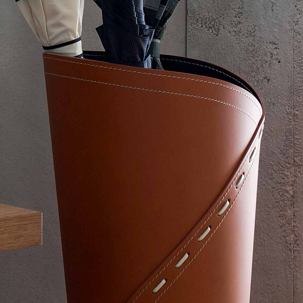 The Katrina umbrella stand is made of regenerated leather, which covers both the external and internal surfaces. The visible stitching is an elegant detail that contributes to conferring a decorative value to a purely functional complement.
