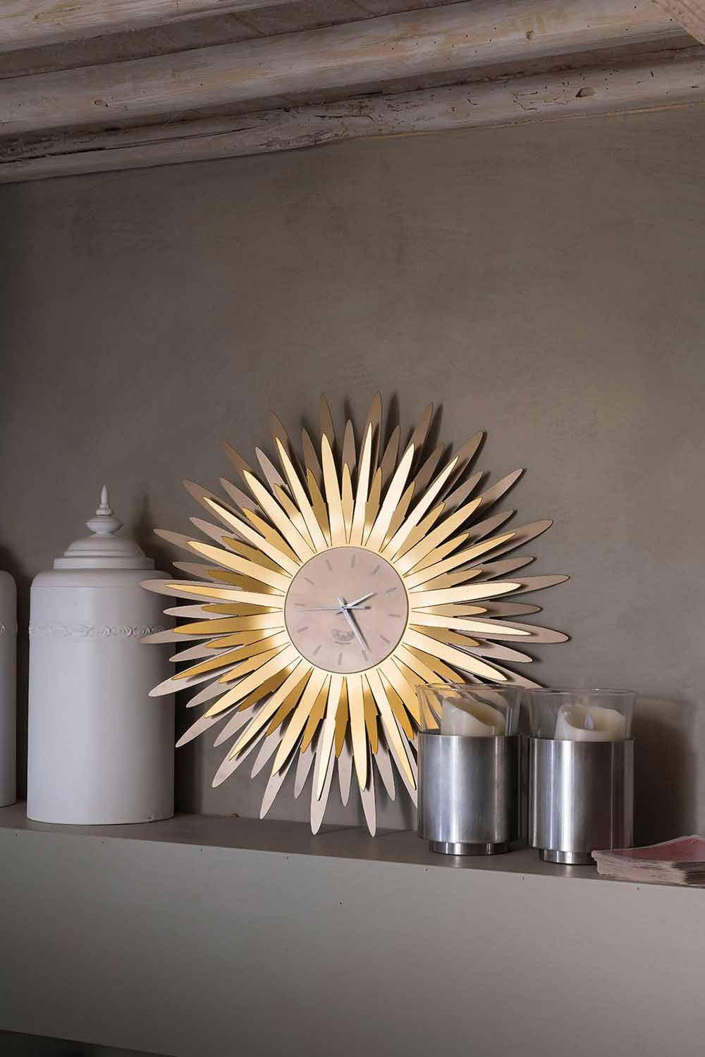 Fuoco is a harmonious wall clock characterized by numerous and bright sunbeams around the dial.