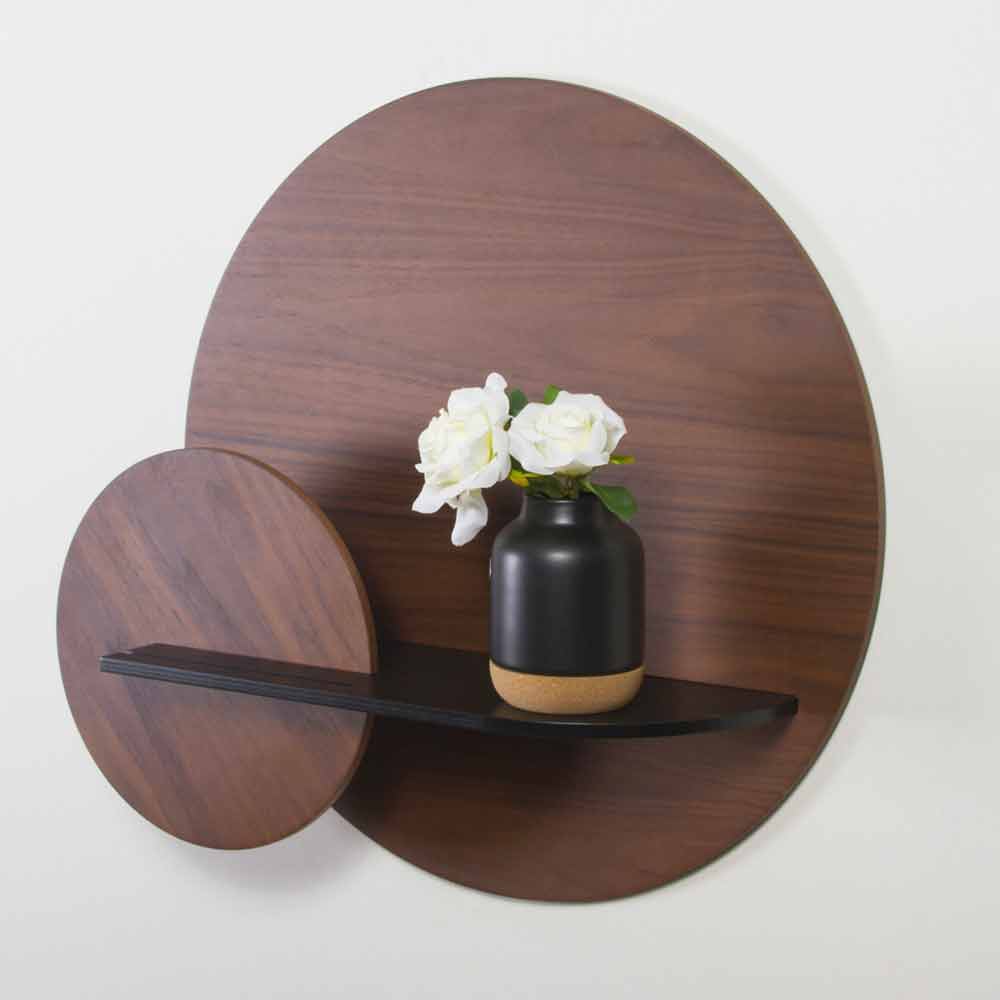 This shelf consists of 3 plywood panels, one of which in black stained ash finish fixed to the wall with a metal support that acts as a real support surface and two other vertically mounted round-shaped panels made in walnut finish , which they can be positioned in 8 different configurations allowing to obtain a customizable product according to tastes and needs. In order to further increase the functionality of this wonderful article, there is a practical cable hole positioned behind the smaller vertical panel, ideal for hiding any type of cable or charger. This design object is undoubtedly an original and innovative idea that thanks to its minimal style and geometric lines combined with the quality materials used and the finishes give life to an elegant and versatile product capable of revolutionizing the atmosphere of any room. with a contemporary taste. Quick and easy to clean using a simple damp cloth.