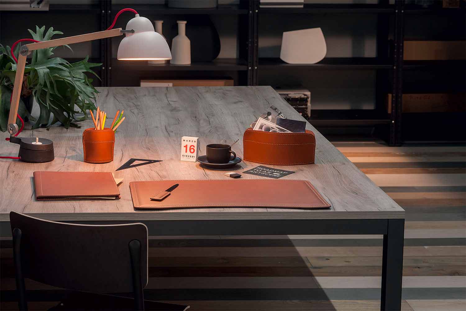 The set of Brando office accessories includes functional, but at the same time decorative complements. They are produced in regenerated leather in Italy by skilled craftsmen specialized in the processing of this material.