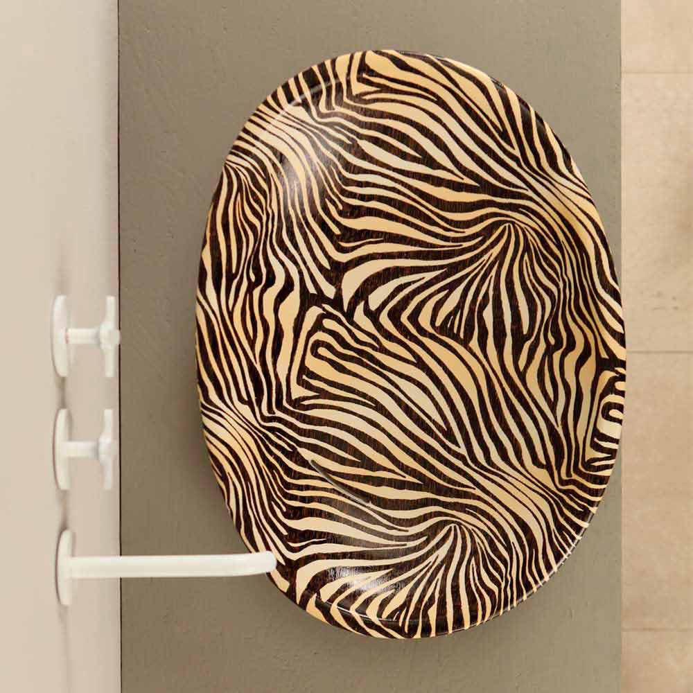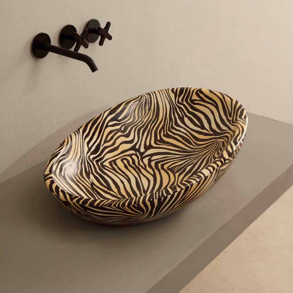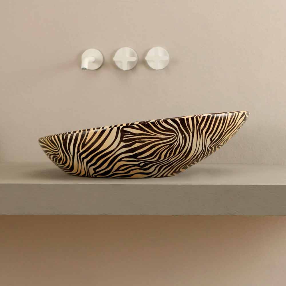 Design ceramic countertop washbasin with orange zebra made in Italy Glossy Sloped washbasin, with a soft and elongated shape, characterized by a continuous water flow drain.