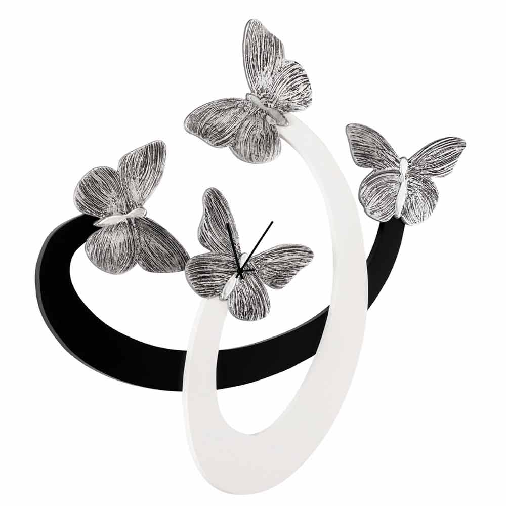 Zenia is an elegant wall clock, black and ivory lacquered. It is hand-decorated with silver leaf on materico.