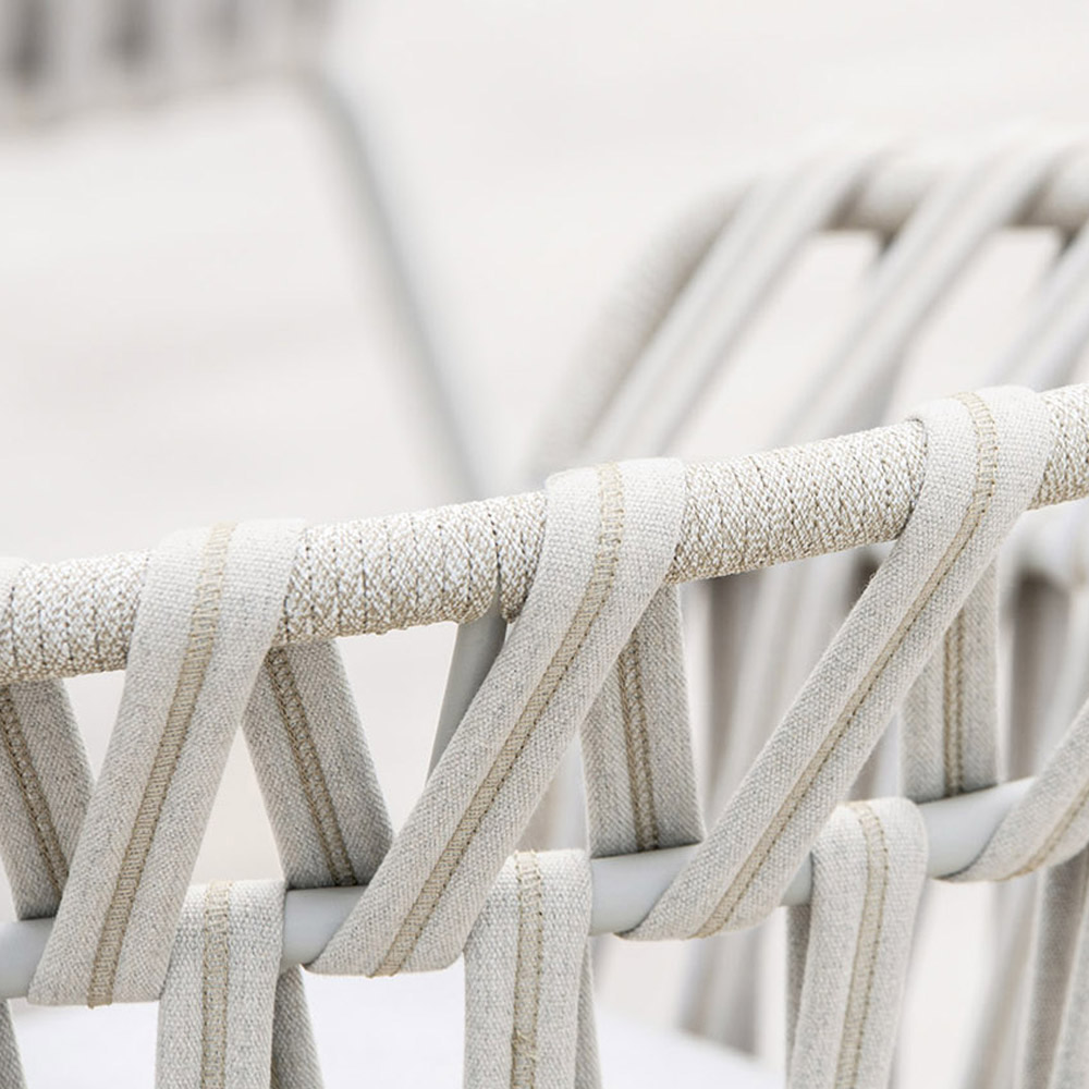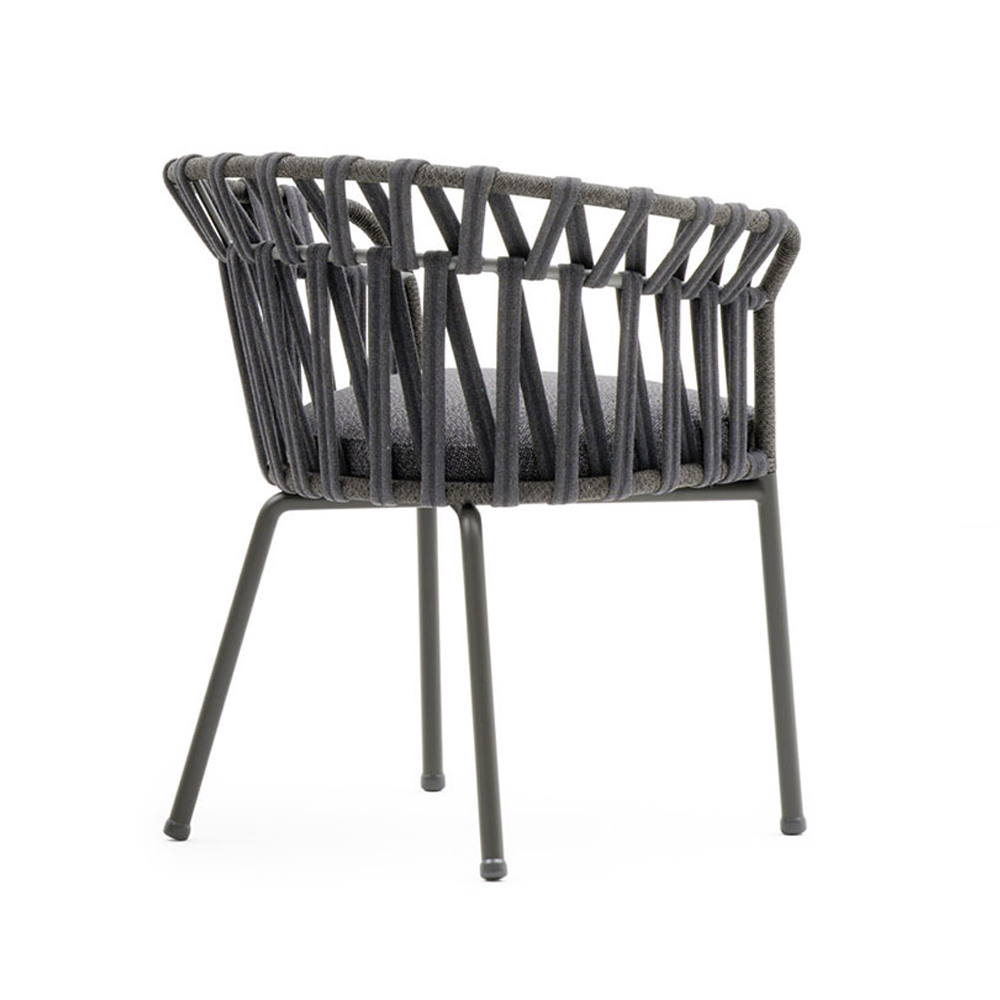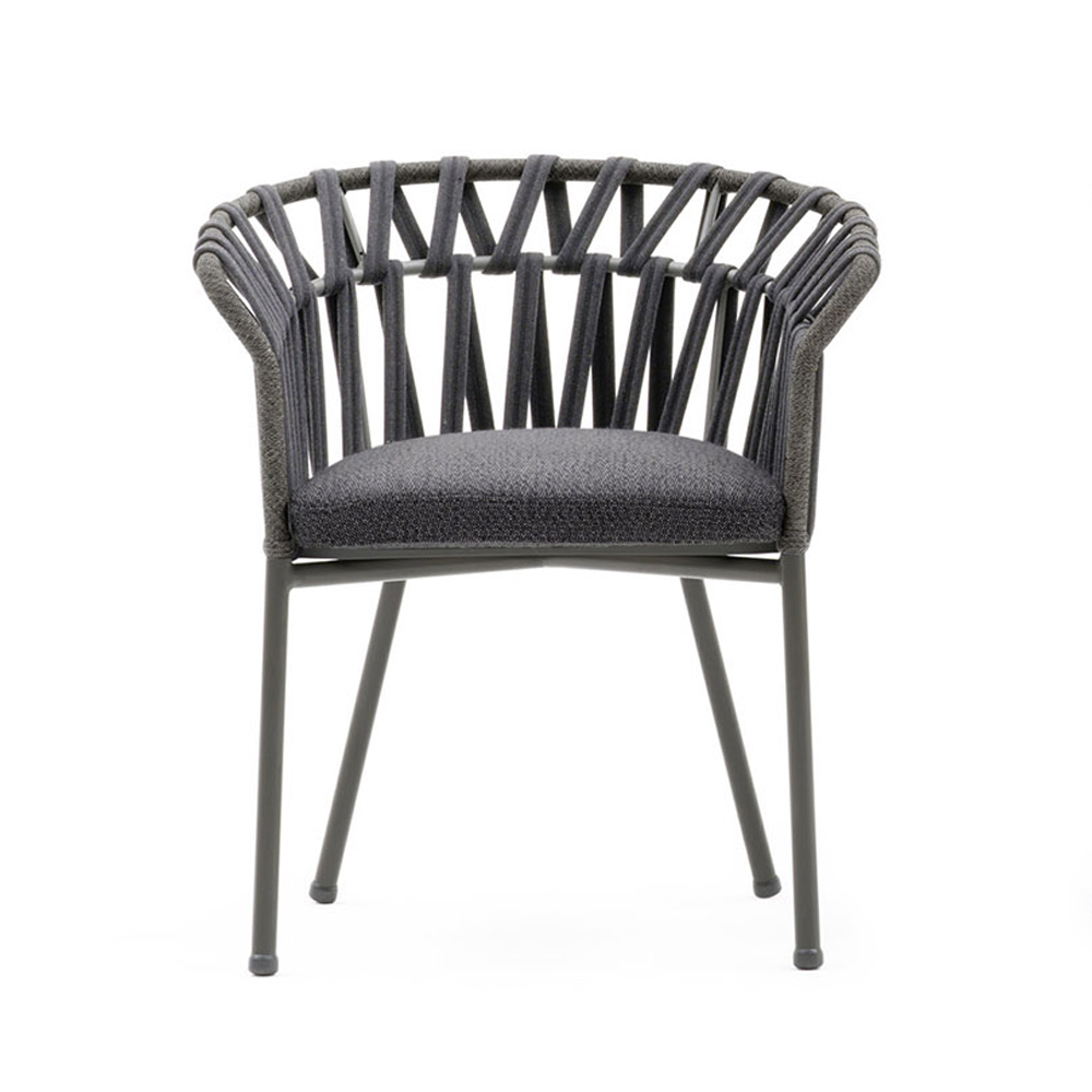 Outdoor armchair with base in powder-coated aluminum , removable seat in removable fabric and back in aluminum enriched with an intertwining of handmade acrylic fabric cords . Its design is inspired by the elegant and light shapes of the corolla of a flower and is made unique by the weaving created following a particular geometric pattern that perfectly matches the delicate and enveloping shapes of the structure that welcome and relax. What is born is a fresh and innovative furnishing solution enriched by the wonderful refined nuances thanks to which the outdoor naturalness is transformed into contemporary elegance.
