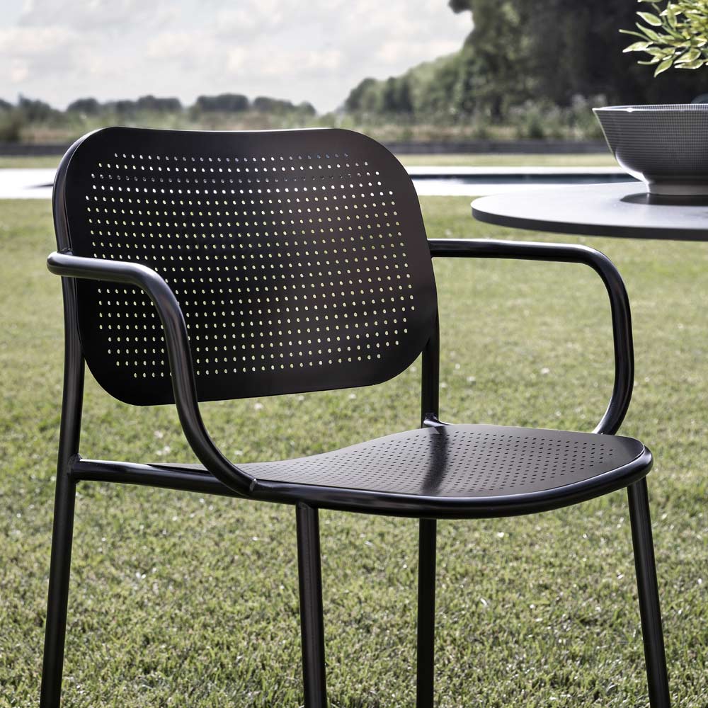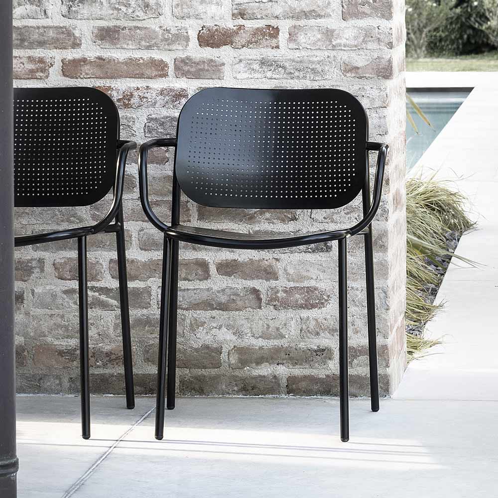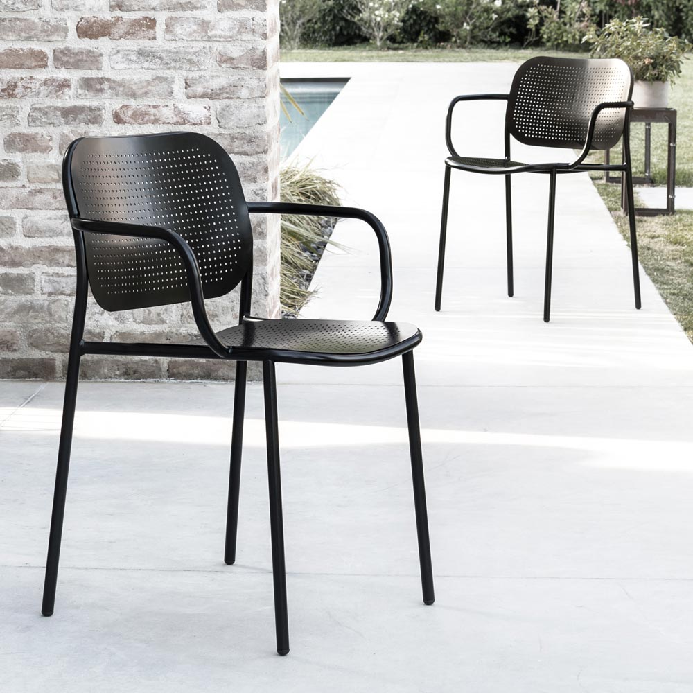 Stackable outdoor chair with painted metal tubular structure completed by the seat and back in sheet metal with perforated texture, an effect that revisits the classic Viennese weaving in a contemporary key. Made through a 100% Made in Italy production process , this chair offers excellent solidity thanks to the use of high quality raw materials and the special metal treatment that makes the finish of the product particularly resistant to atmospheric agents.
