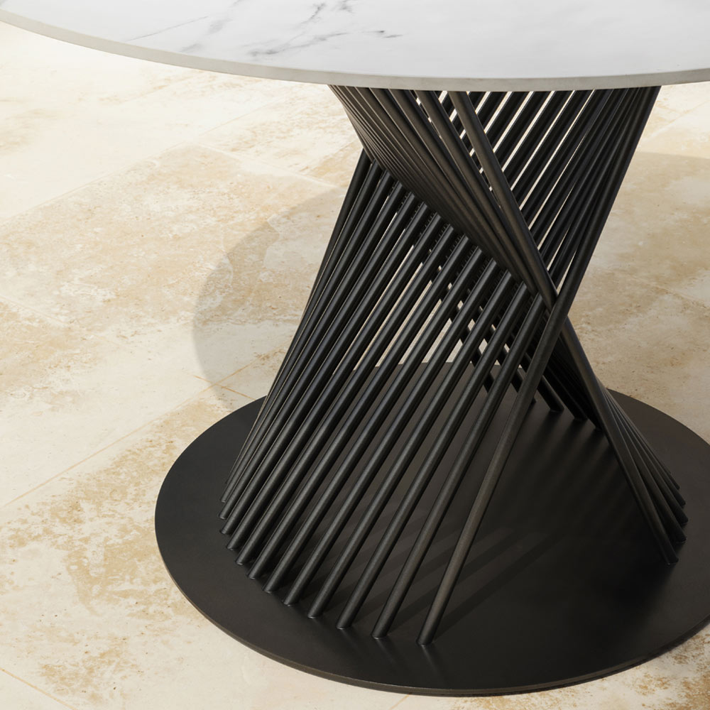 Made in Italy outdoor dining table composed of a cast aluminum structure and a round top in marble-effect porcelain stoneware. The base represents the most original detail giving this table a strong modern character and a refined and formal design .