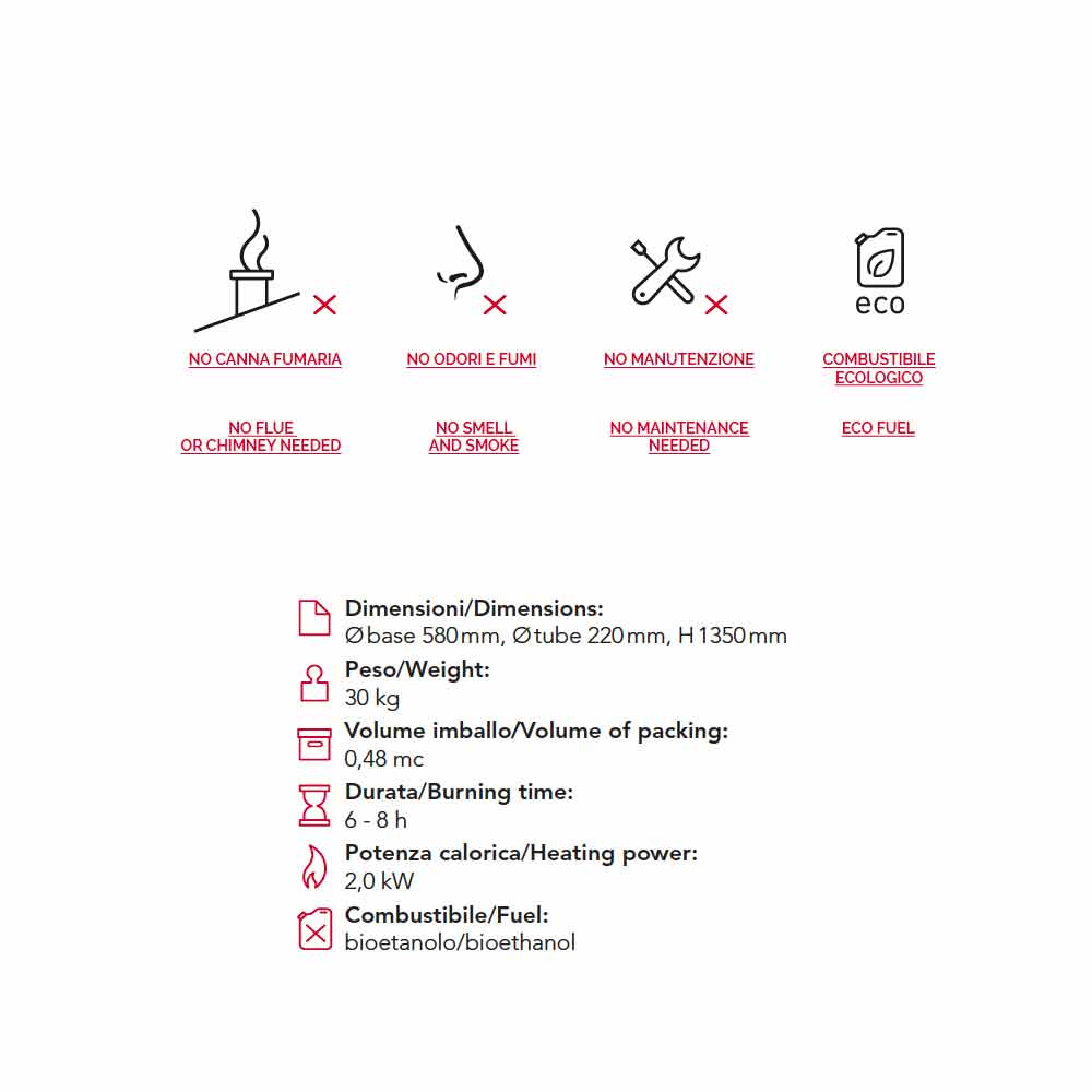 Its design is essential and minimal; its functionality and beauty come together in this piece of furniture for outdoor use. Made of painted steel to ensure stability, the bioethanol burner is positioned on the top of the column.