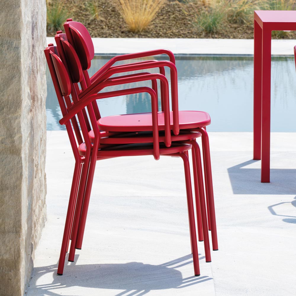 Stackable outdoor armchair entirely made in Italy in recyclable galvanized and painted metal complete with practical and comfortable armrests . A piece of furniture for outdoor spaces that combines design and practicality . Its simple and particularly modern shapes, the bold and bright colors that give liveliness to the context and the functionality brought to the highest levels make this chair a perfect solution for furnishing any environment, both domestic and contract.