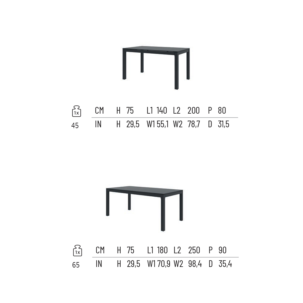 L 180/250 x D 90 x H 75 cm (1 extension of 70 cm).