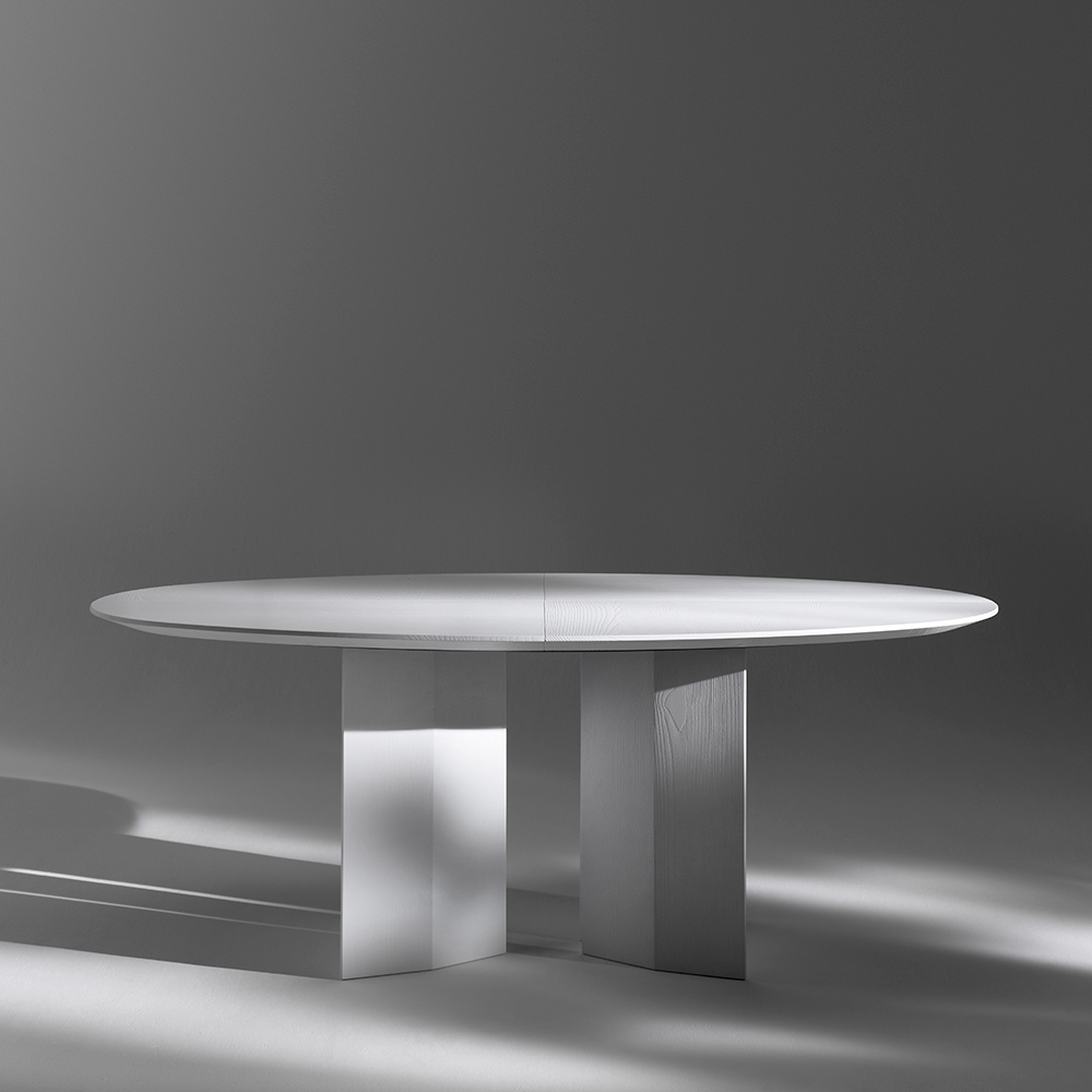This oval dining table stands out for its sculptural and essential design, where full volumes and balanced proportions create a visually striking piece of furniture. The oval top interacts with the central base, creating a solid and harmonious composition, designed for contemporary and refined spaces.