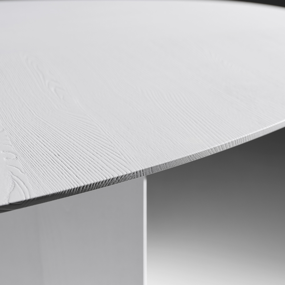 Crafted from heat-treated ash veneer plywood , the table highlights the wood's natural grain, enhancing its textured character and chromatic depth. It's also available in black or white lacquer , making it versatile enough to adapt to a variety of styles, from minimal to bold and graphic.