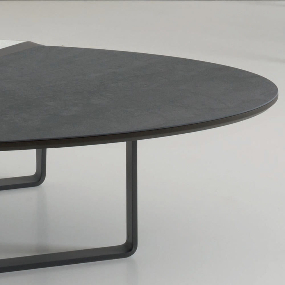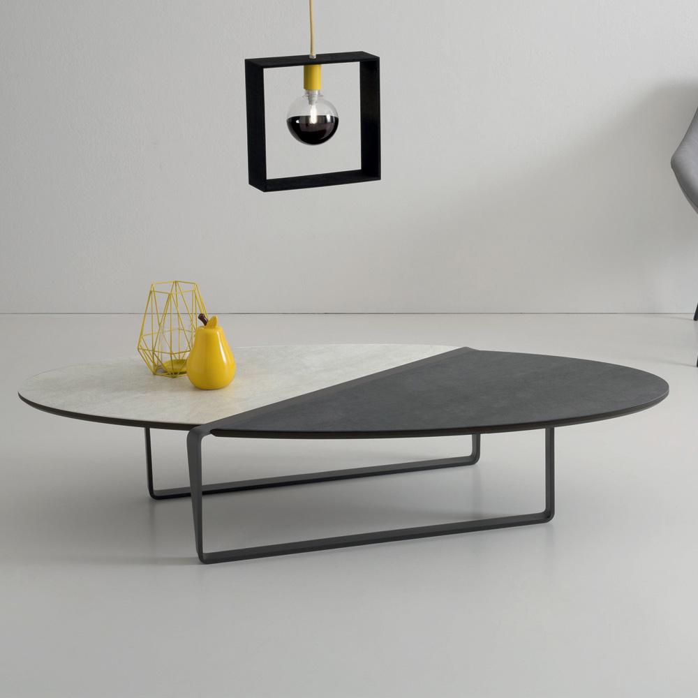 This oval designcoffee table features an embossed graphite powder coated metalbase and a two-tone matte ceramic top on panel. The peculiar feature of the complement is given by the top made in anthracite stone of savoy and pearl stone of savoy. A double finish for lovers of light and color. The metal structure separates and unites the two halves at the same time in a game of contrasts that gives life and character to the surrounding area.