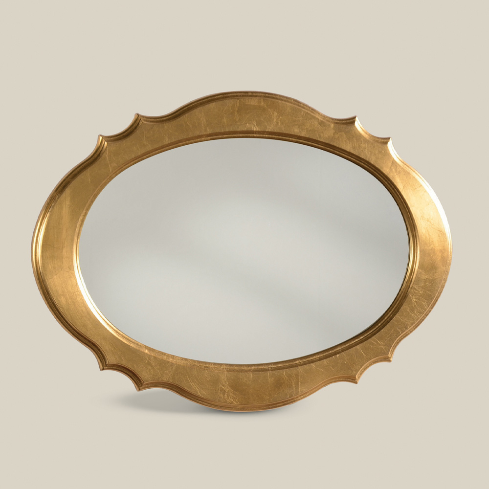 Classic style oval-shaped wall mirror with frame made of wood and decorated with elegant gold leaf , perfect for decorating your living area with personality and taste. A unique and refined complement, completely made in Italy by skilled master craftsmen , masters of art who finish each complement with wisdom and taste for elegance. The production is carried out using fine materials , and performing the workbyhand with the utmost care and professionalism that distinguishes Made in Italy products.