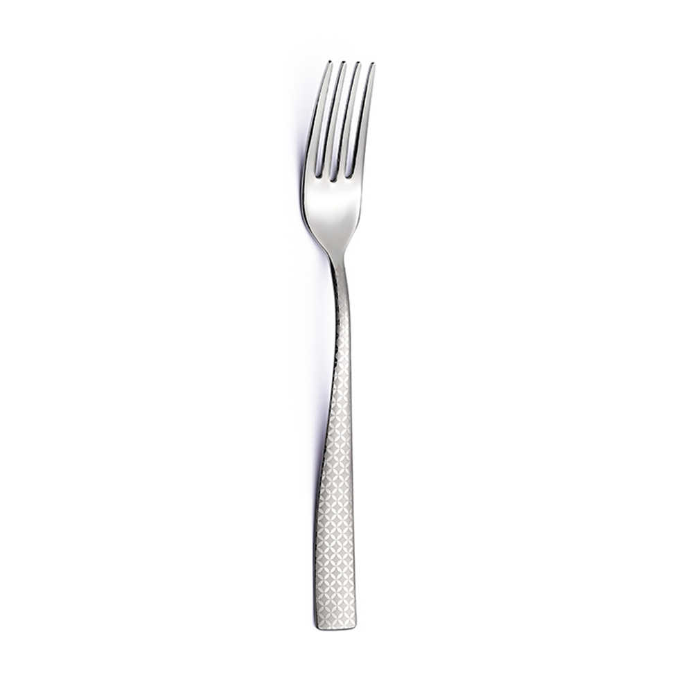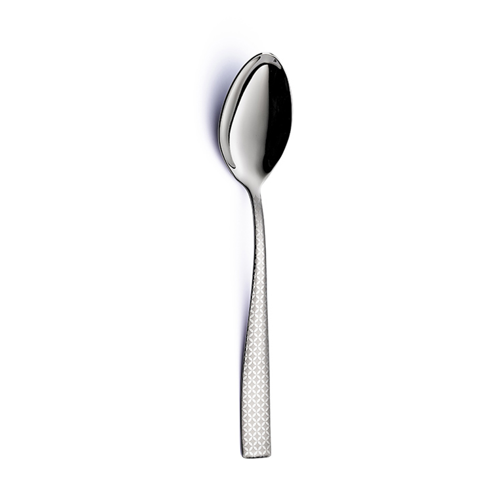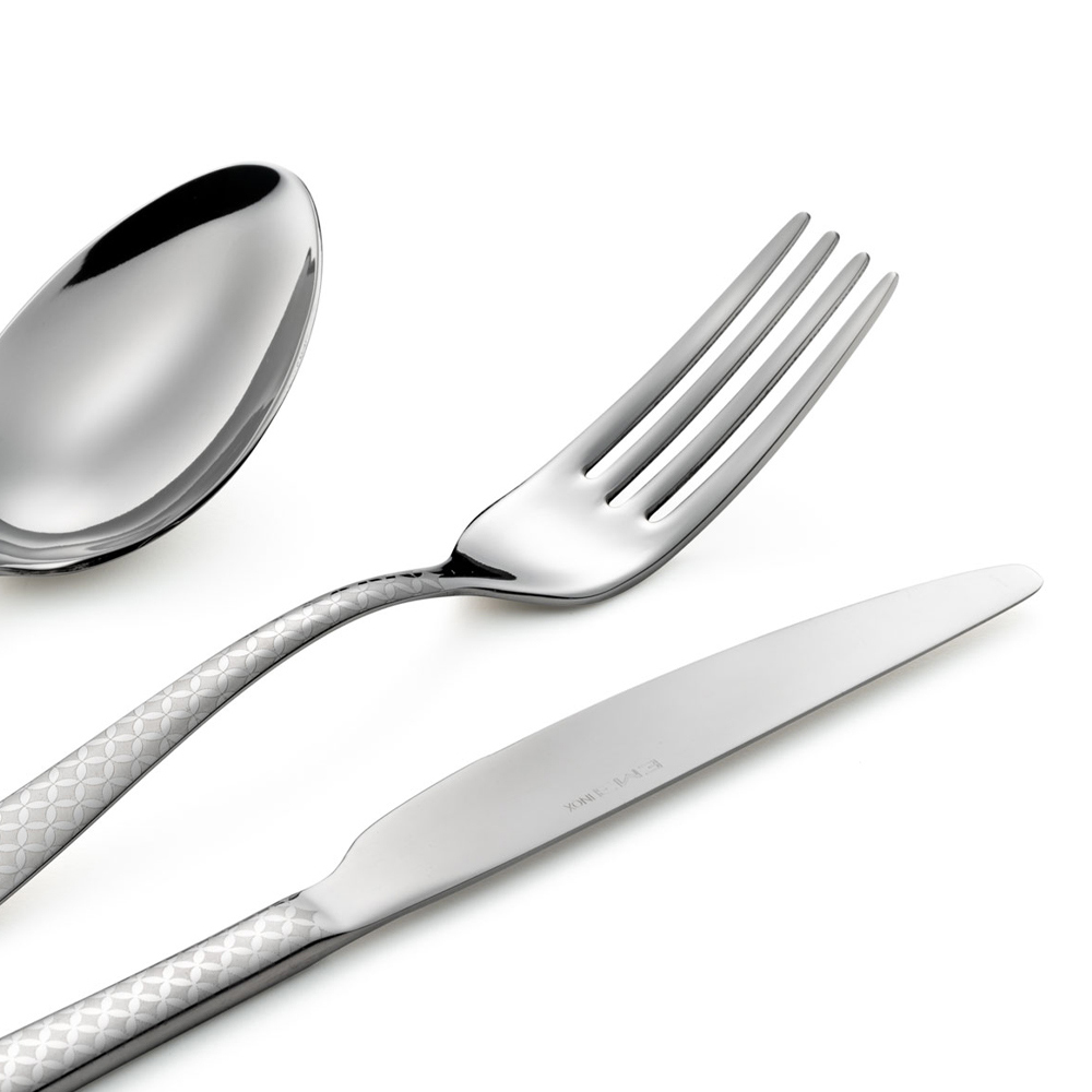 The collection is distinguished by the sophisticated geometric design made with high-tech laser. The minimal design of the wide handles, the shaped and elongated shape of the bowl of the spoons and the sobriety of the fork evoke an idea of purity and infinity.
