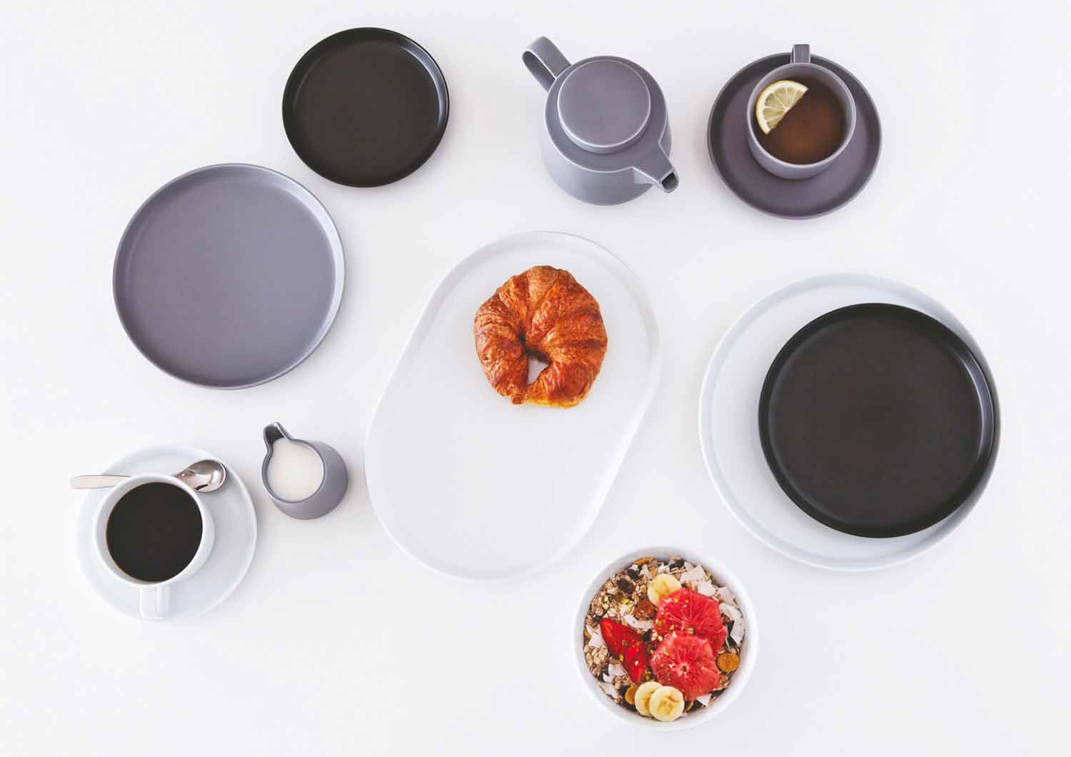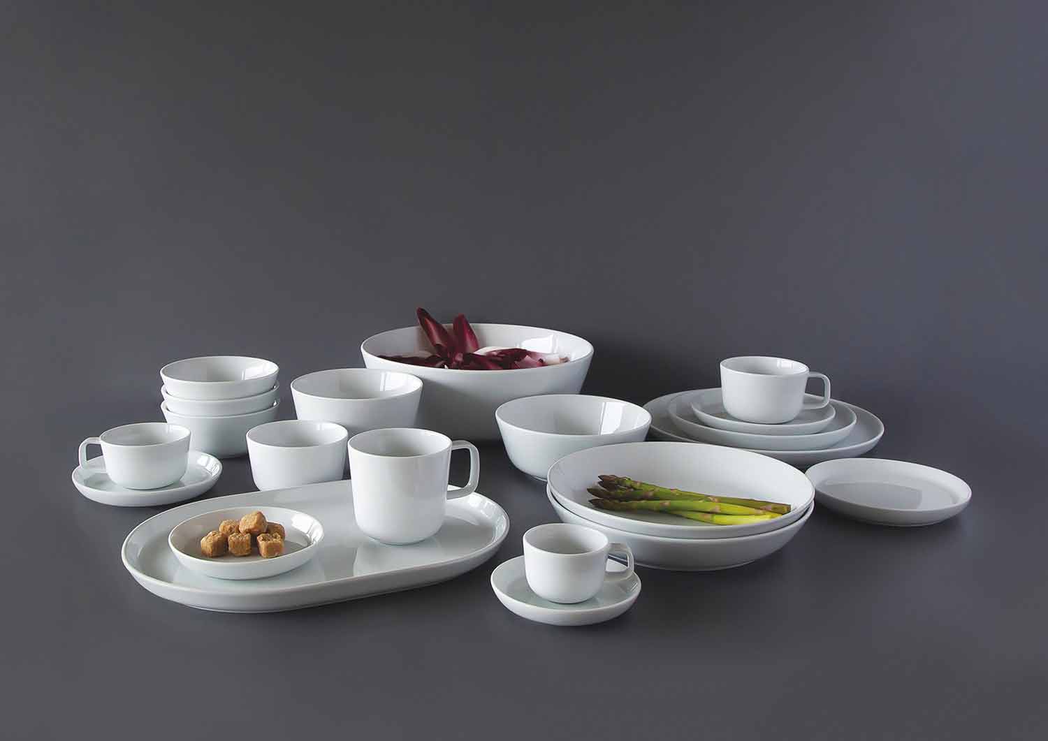 The inspiration for this teacup set comes from the modern simplicity of Scandinavian design and landscape . The shape is a perfect and balanced synthesis between a coupé plate and a traditional one with the edge: in fact it has a spacious center with a narrow and steep edge . In this way aesthetic elegance and functionality are combined to provide a greater area dedicated to the presentation of food and a practical handling of the plate.
