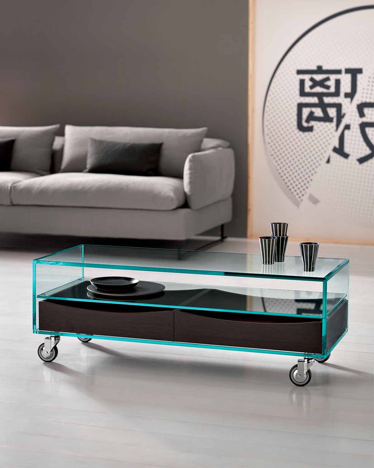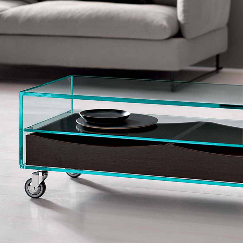 Modern style living room coffee table on wheels in extraclear glass with two wengè wood drawers, Made in Italy.