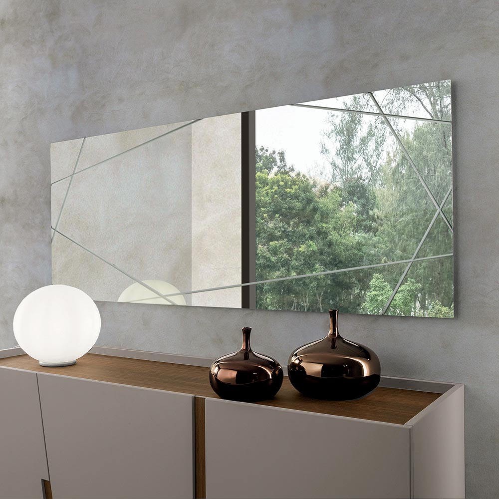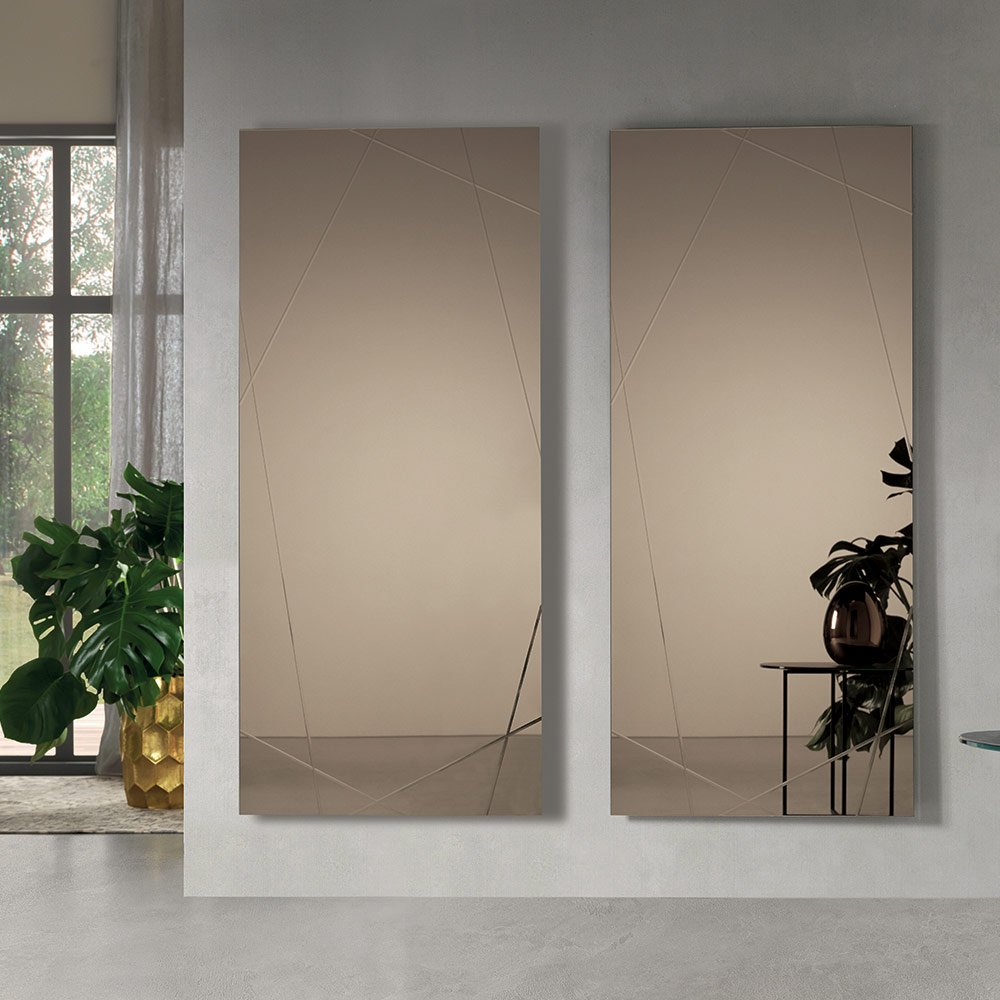The mirror has a rectangular shape, a thickness of 4 mm , and features laser-cut engravings that create an elegant geometric pattern on the surface. This decorative detail creates a refined play of light and reflections, giving the mirror depth and personality.