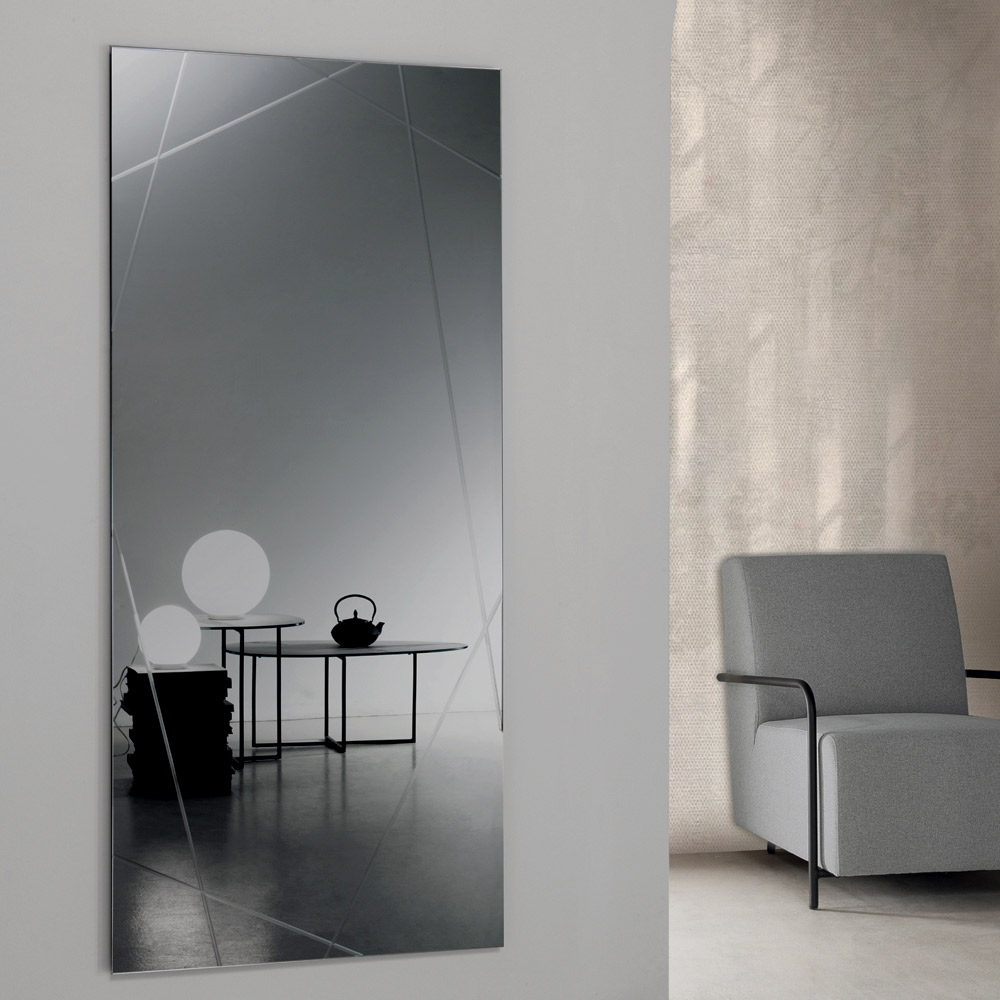 An elegant , Made in Italy designer wall mirror , ideal for enhancing spaces such as the entrance , living room , or bedroom . Its essential, contemporary design stands out for its pure lines and refined graphic details that enrich the reflective surface.