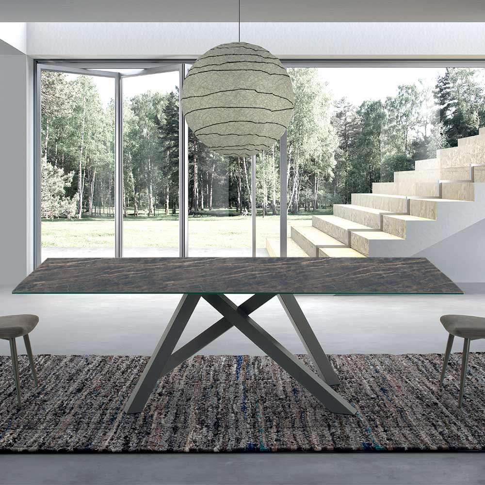 Table with hypermarble top and dove gray steel base of modern design made in Italy.