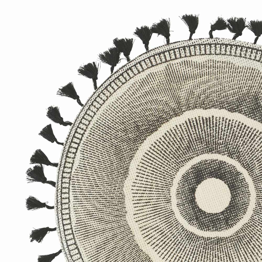 Round placemat set in white jute decorated with black fringes, 12 pieces.