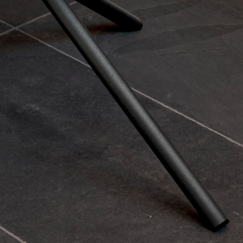 This round coffee table features an embossed graphite powder coated metalwoven structure and matte ceramic top on panel. The peculiar feature of the complement is given by the intersection of the legs for a refined and classy design.