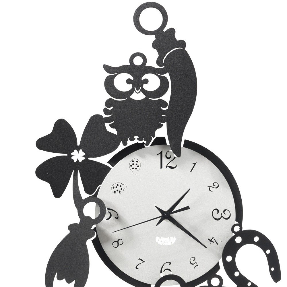 This wall clock features an original and cute designwith a circular dial and a frame of lucky symbols such as owls, horseshoes and chillies.