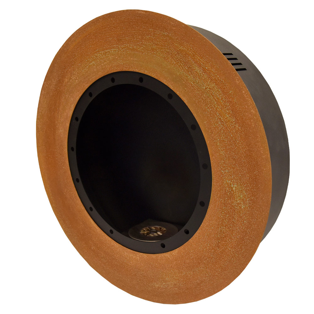Wall bio-fireplace of modern and round design in steel, made in Italy.