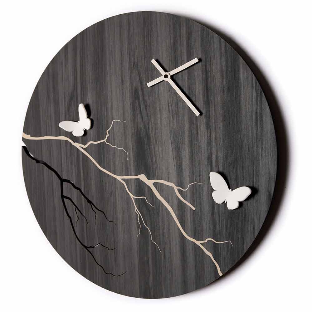 Round wooden wall clock with laser engraved decorations and three-dimensional butterflies, made in Italy.